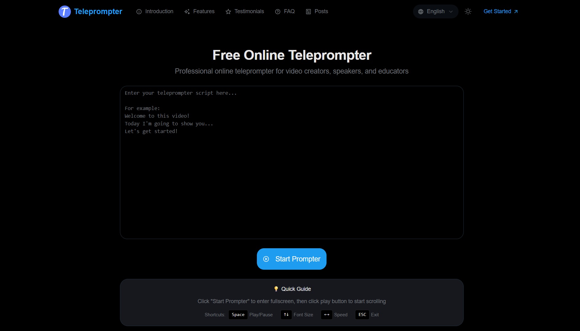 A Online Teleprompter conta com uma interface simples e intuitiva, permitindo aceder rapidamente às principais funcionalidades. Para começar a usar, basta introduzir o guião que está a usar e clicar num botão para ter acesso direto a um teleponto personalizável.