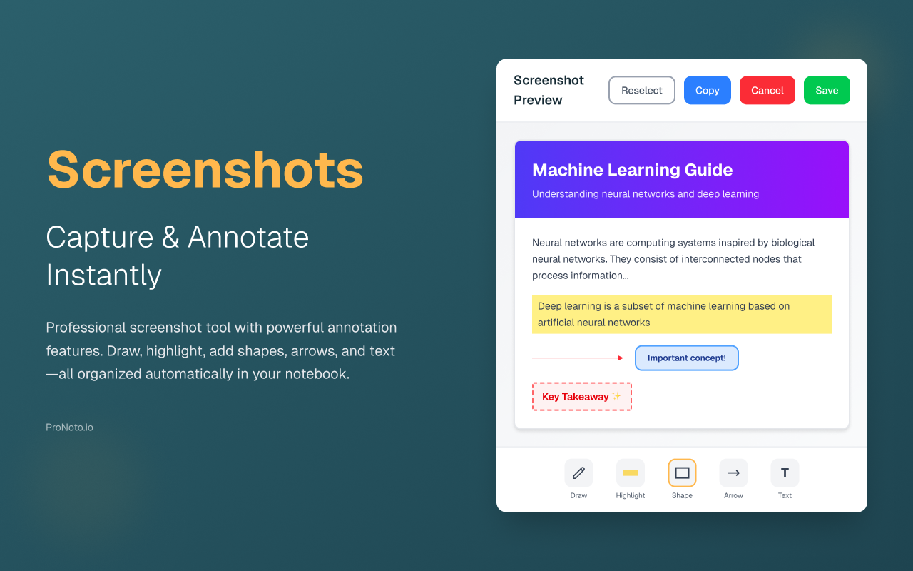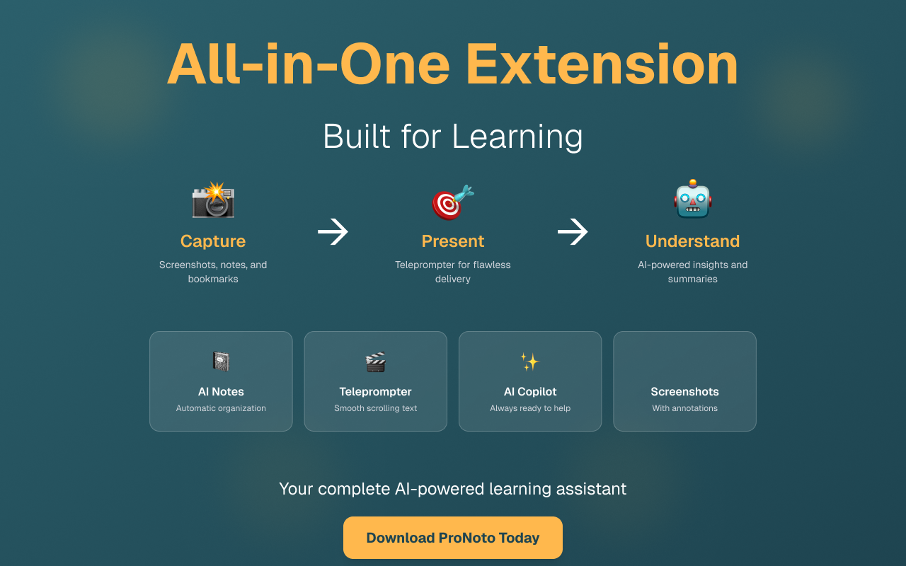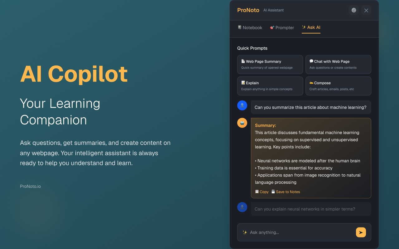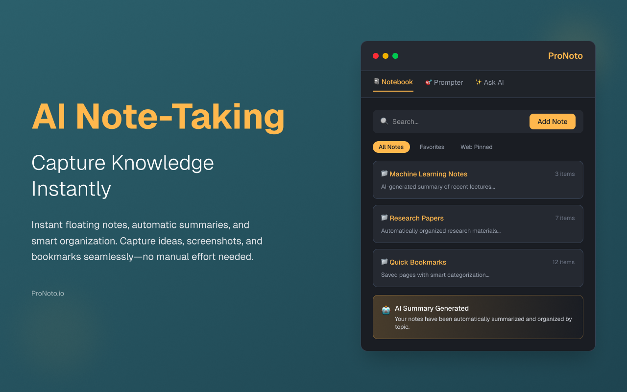 Através da funcionalidade de anotações com IA é possível gerar resumos automáticos, criar notas flutuantes que estejam sempre à mão e organizar todo o conteúdo por pastas. A ProNoto analisa também o conteúdo das páginas e ajuda a estruturar a informação para facilitar a criação de apontamentos a partir de diferentes tipos de texto.