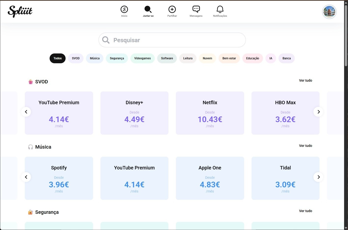 O Spliiit suporta uma vasta gama de serviços, desde entretenimento de vídeo (Netflix, Disney+, YouTube Premium e outros), música (Spotify, Apple Music, Tidal e outros) e videojogos, passando por ferramentas de produtividade (Microsoft 365, Canva e outros). Saiba mais e explore o serviço a partir da página oficial em spliiit.com.