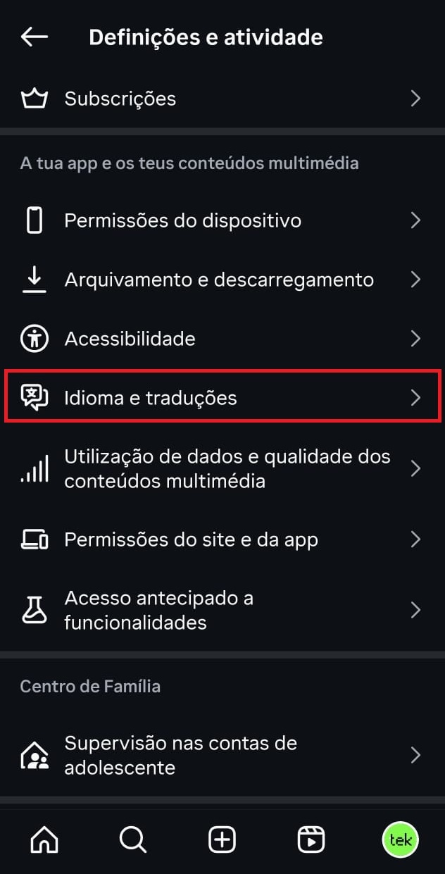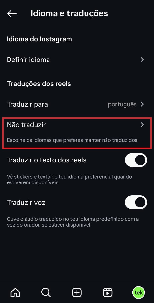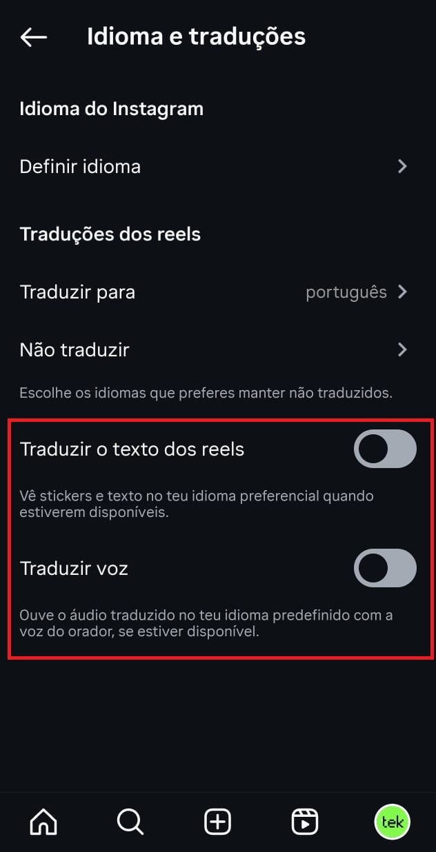 5 - A partir da secção “Idioma e traduções” também pode desativar a tradução de texto nos Reels, assim como da voz e áudio dos vídeos.