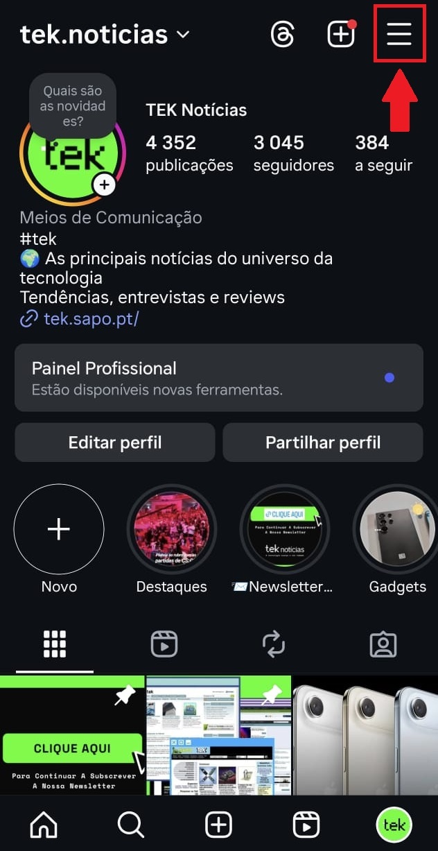 1 - Aceda ao seu perfil no Instagram e toque no ícone com três barras horizontais no canto superior do ecrã.