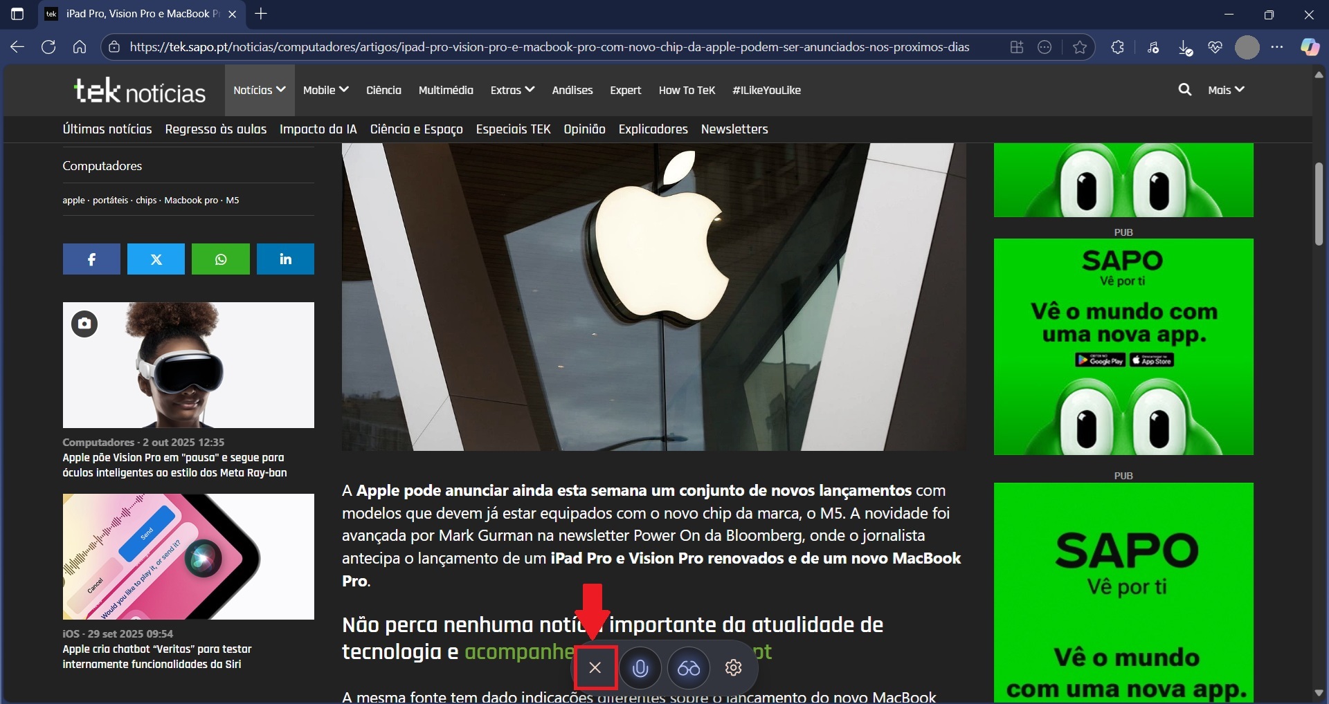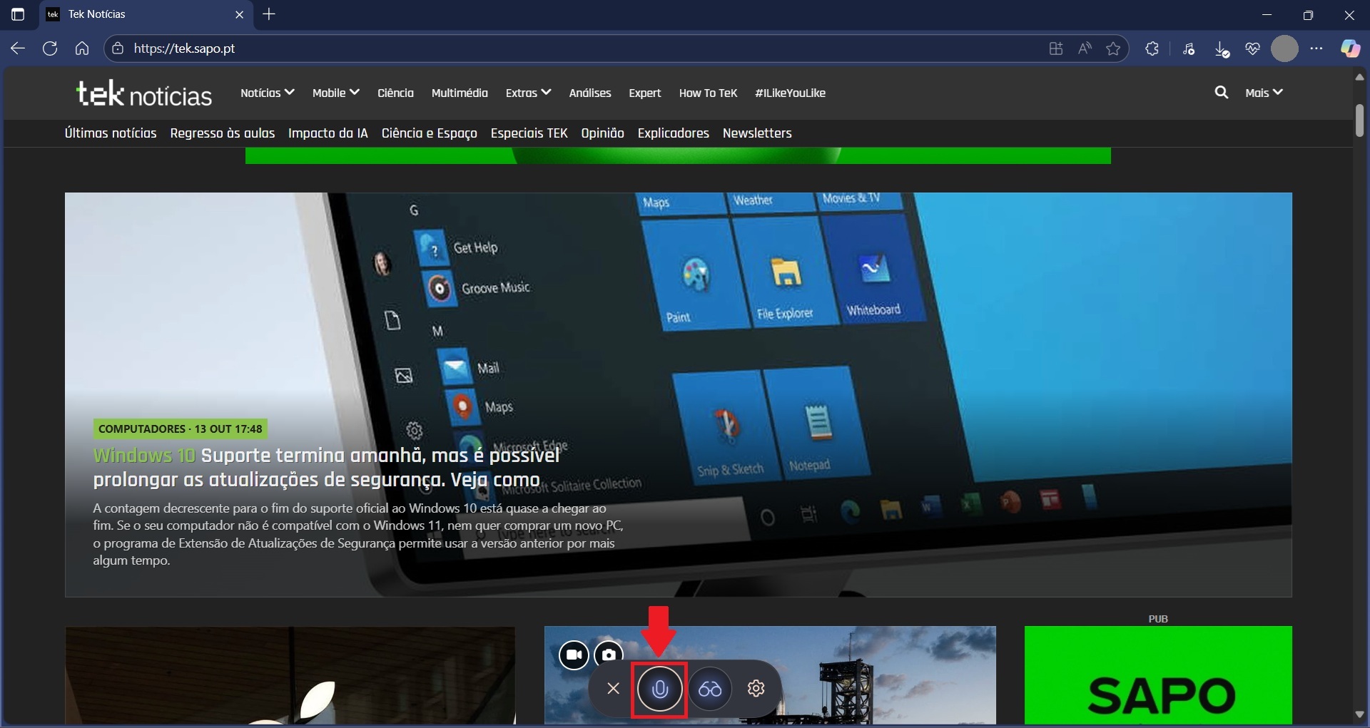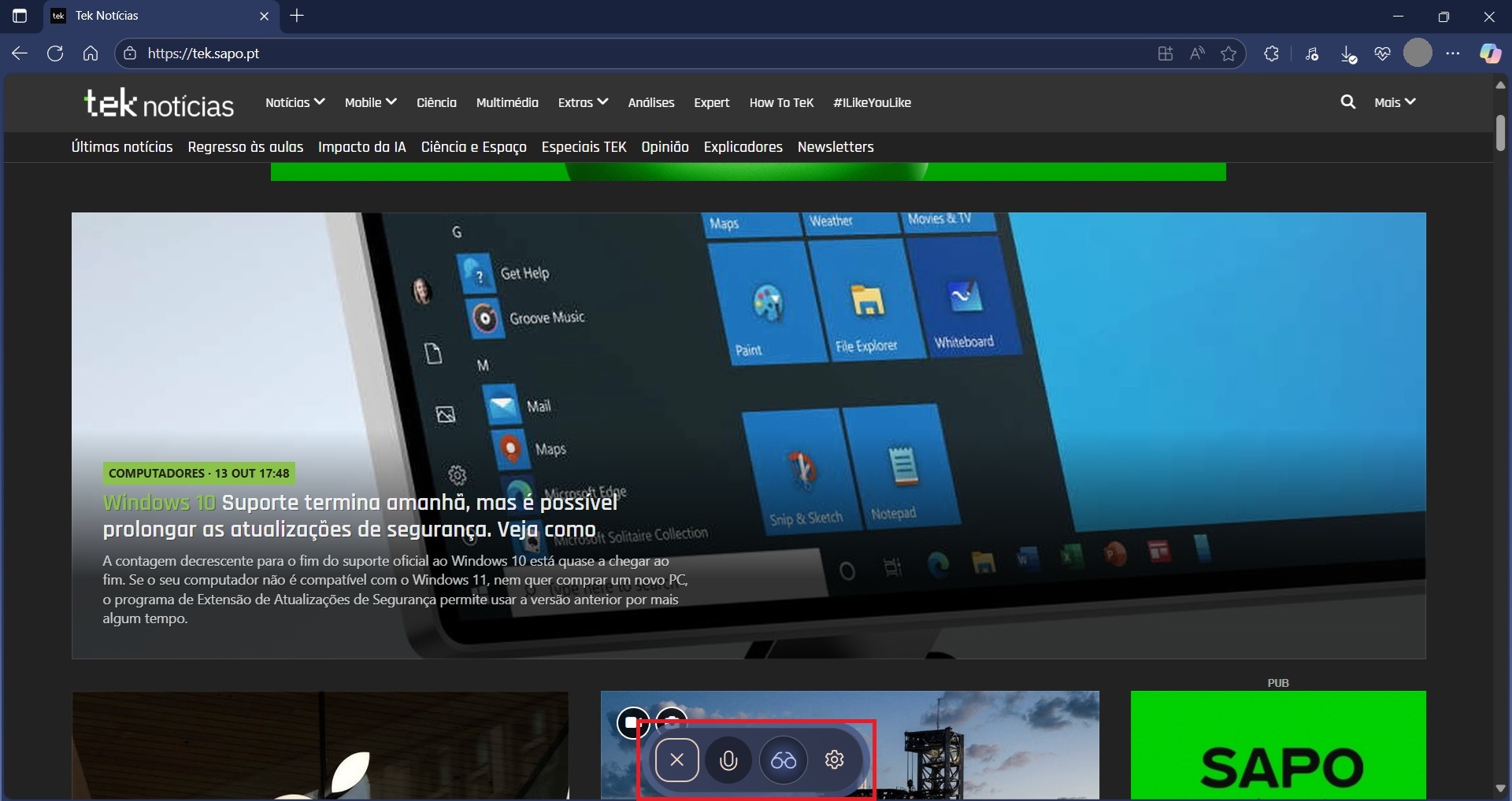 3 - Quando usa o Copilot Vision surgirá uma barra de ferramentas flutuante, acompanhada por um tom que indica que a sessão foi ativada e por uma saudação por voz do Copilot.O ícone com o formato de uns óculos indica que a sessão está ativa e permanecerá ligada enquanto navega.