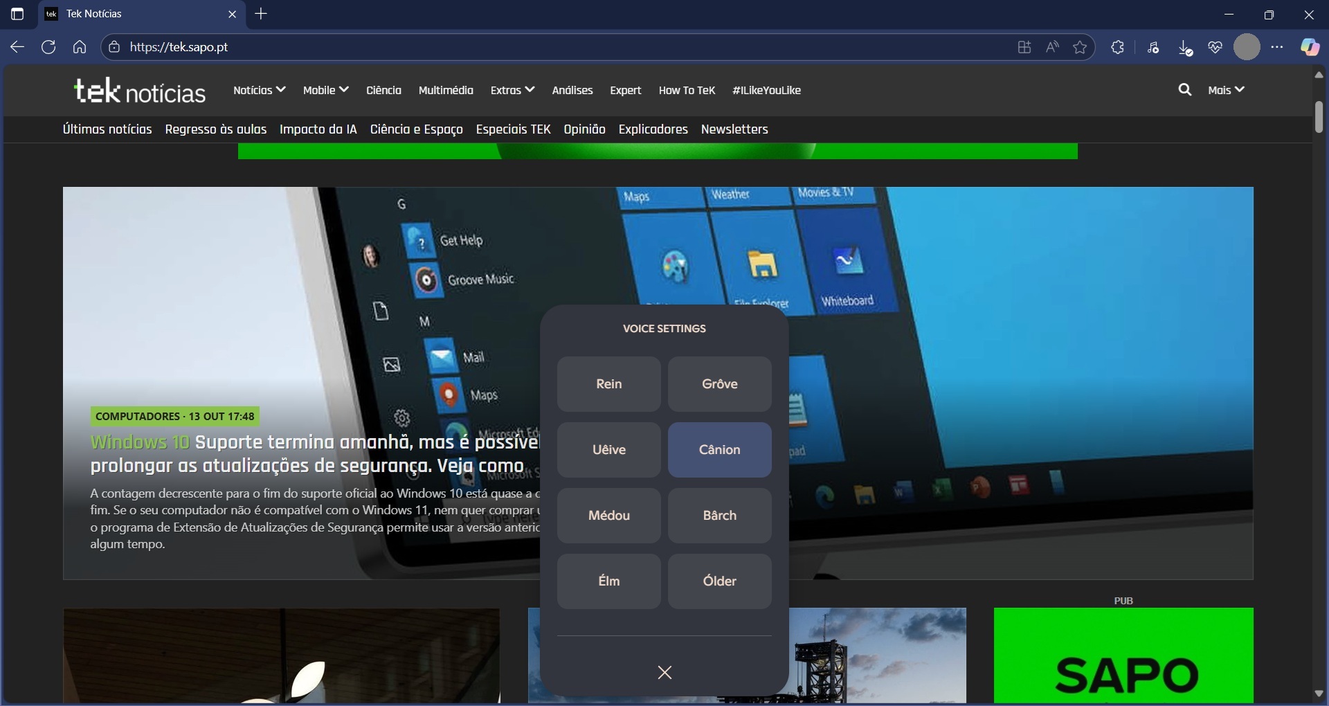 5 - Se desejar, também pode mudar a voz do Copilot. Para tal, clique no ícone com o formato de uma roda dentada. Ao clicar numa das opções apresentadas é possível ouvir uma preview da voz. Uma vez selecionada a opção pretendida, clique no botão com ícone de X.