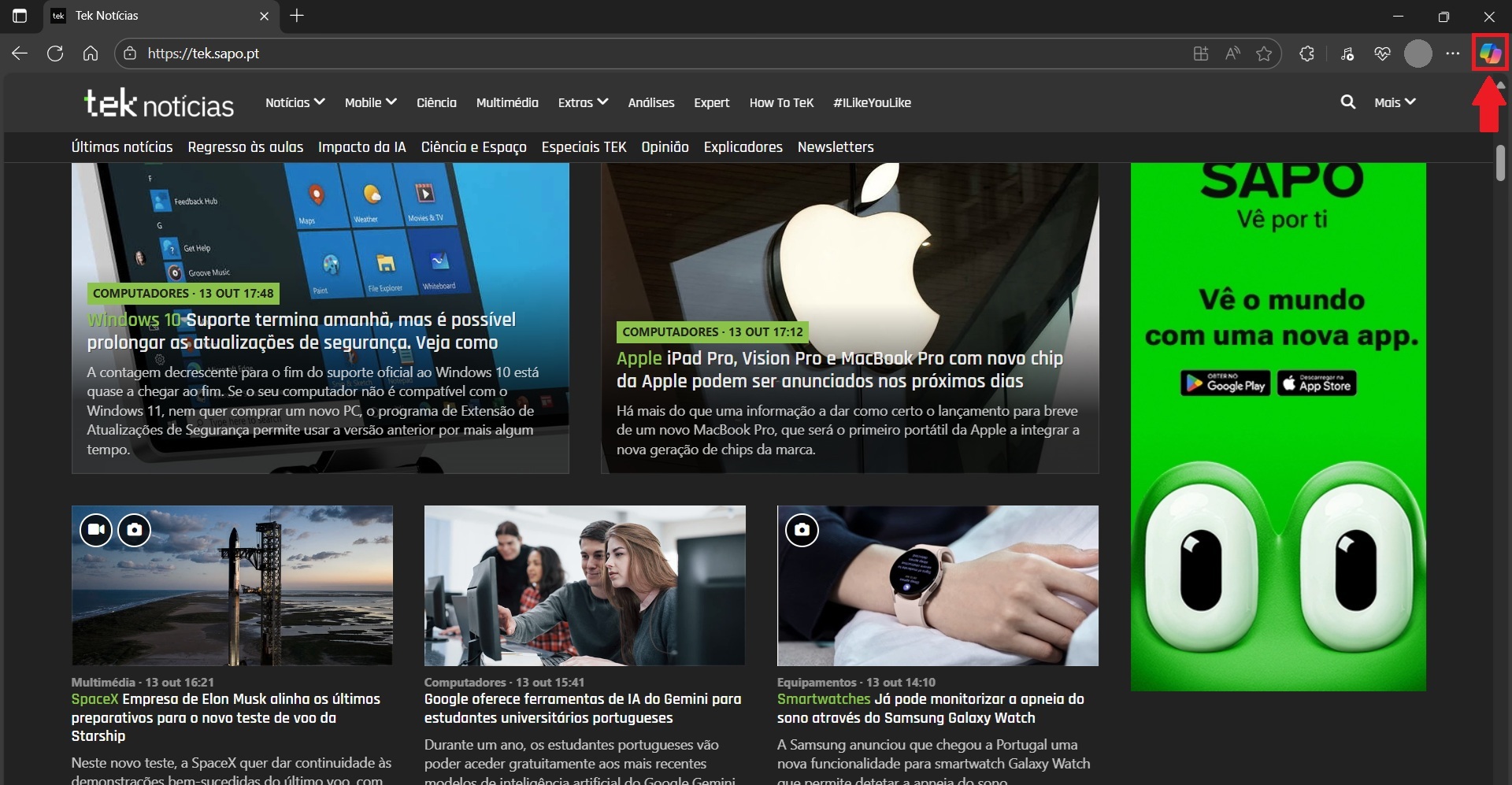 1 - Primeiro, assegure que tem sessão iniciada no Edge com a sua conta Microsoft. De seguida, navegue até ao site, vídeo ou documento PDF sobre o qual pretende fazer perguntas e clique no ícone Copilot no canto superior direito.