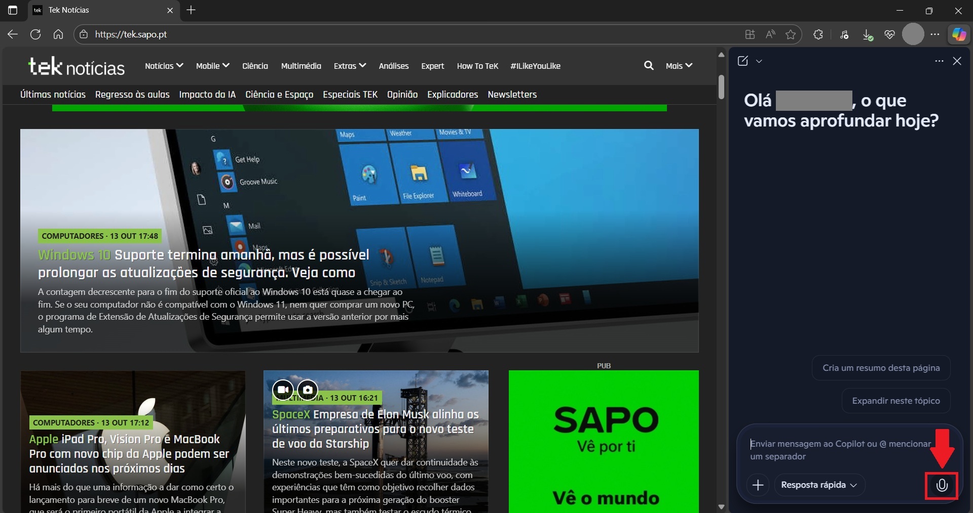 4 - Com o ícone do microfone ativado pode colocar perguntas e interagir com o Copilot. Para silenciar o microfone, basta clicar no botão.