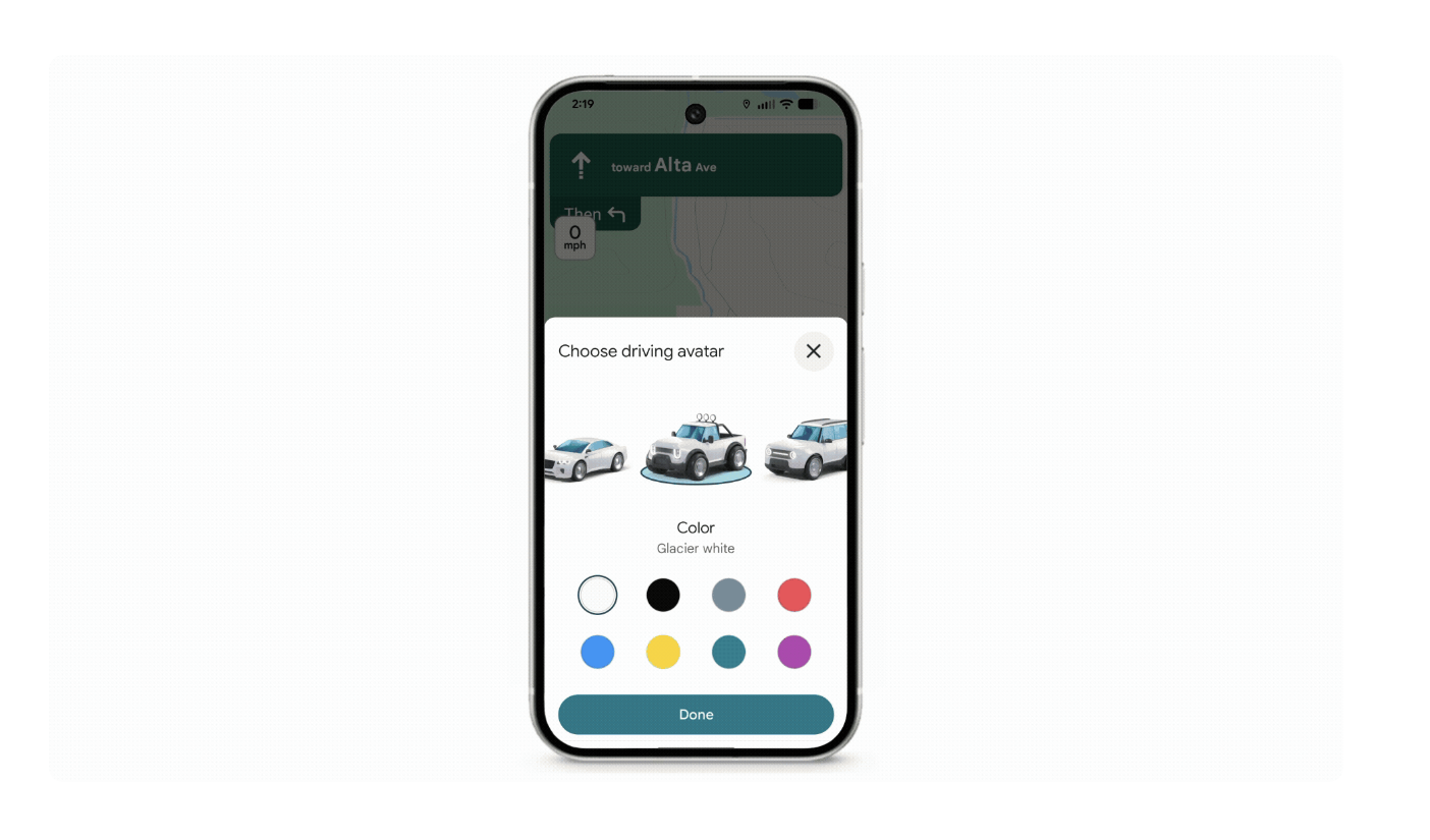 Em vez de seguir uma seta aborrecida no mapa, durante a navegação, pode personalizar a mesma com outros ícones, nomeadamente de veículos. Pode escolher entre carros de corrida ou carrinhas pickup, mediante o estado de espírito. Durante a navegação basta clicar no cursor e escolher o veículo que deseja, deslizando para os lados. Pode ainda optar pela cor do novo cursor animado.