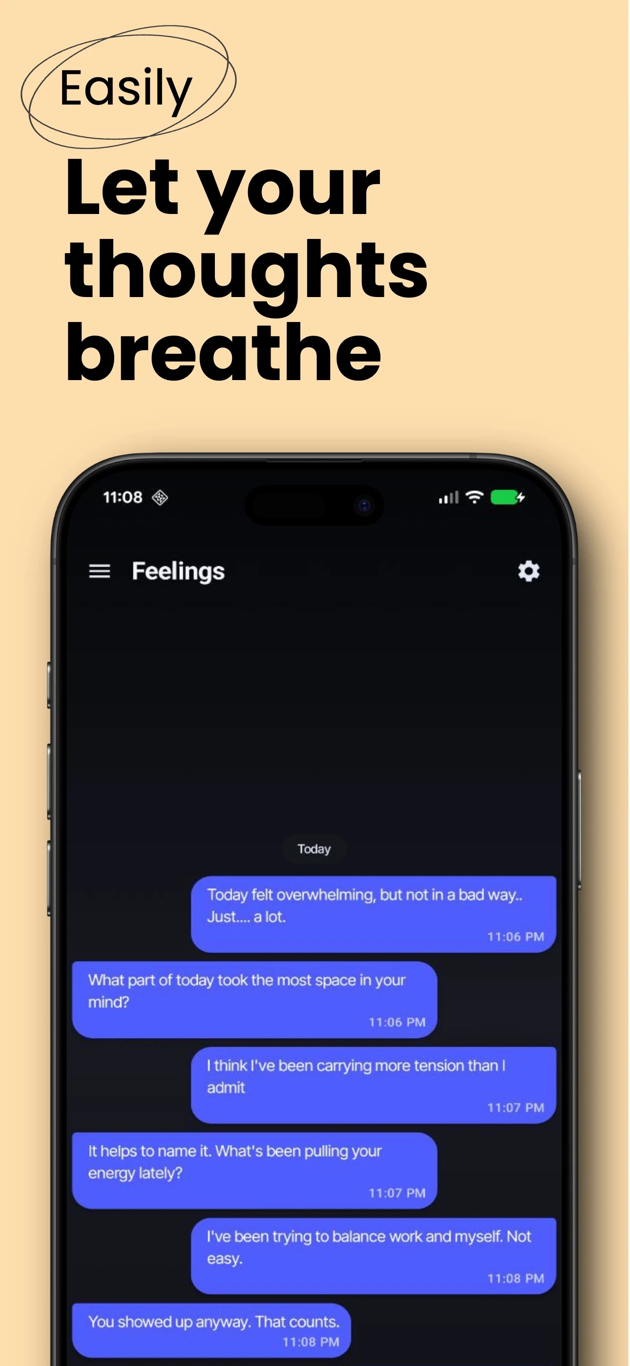 Cada sessão de escrita pode ser associada a uma cor diferente para refletir o seu estado de espírito no momento. Todas as reflexões são agrupadas por dia para o ajudar a rever os seus pensamentos e a compreender a sua evolução ao longo do tempo.