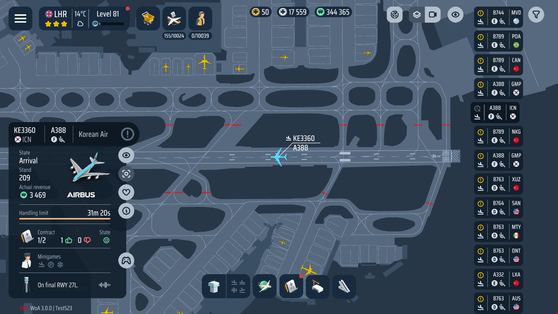 O sistema de progressão permite ganhar dinheiro com cada operação bem-sucedida, investindo na melhoria das equipas e das instalações. À medida que os funcionários sobem de nível, tornam-se mais eficientes. O jogo recebe actualizações regulares que adicionam novos aeroportos, modelos de aeronaves e melhorias de desempenho. A actualização mais recente introduziu o Aeroporto Internacional de Hong Kong, controlo manual do clima, novas funções de alinhamento e descolagem, e melhorias gráficas.