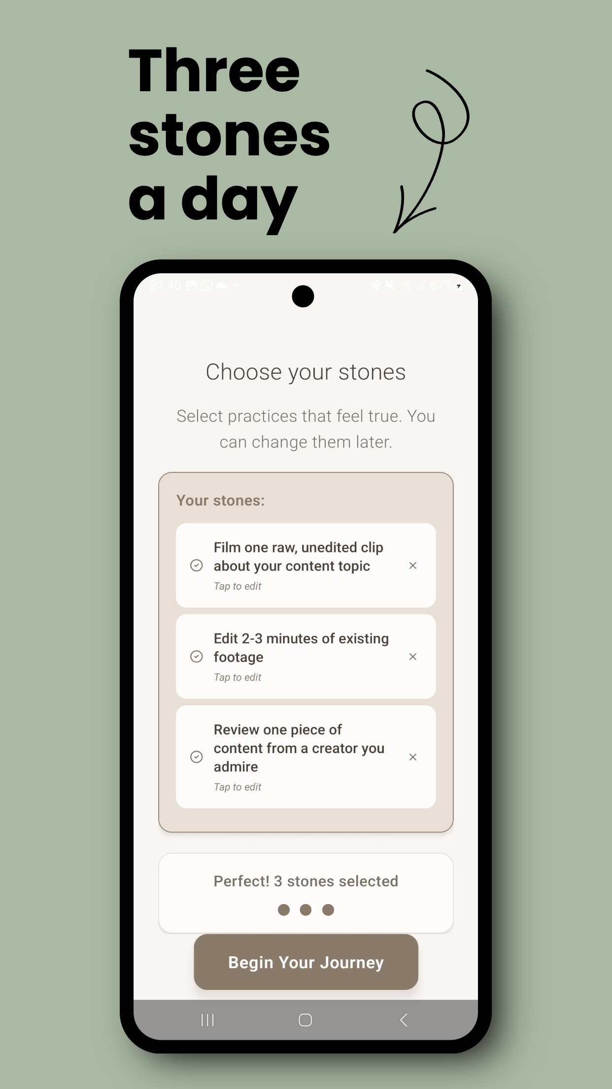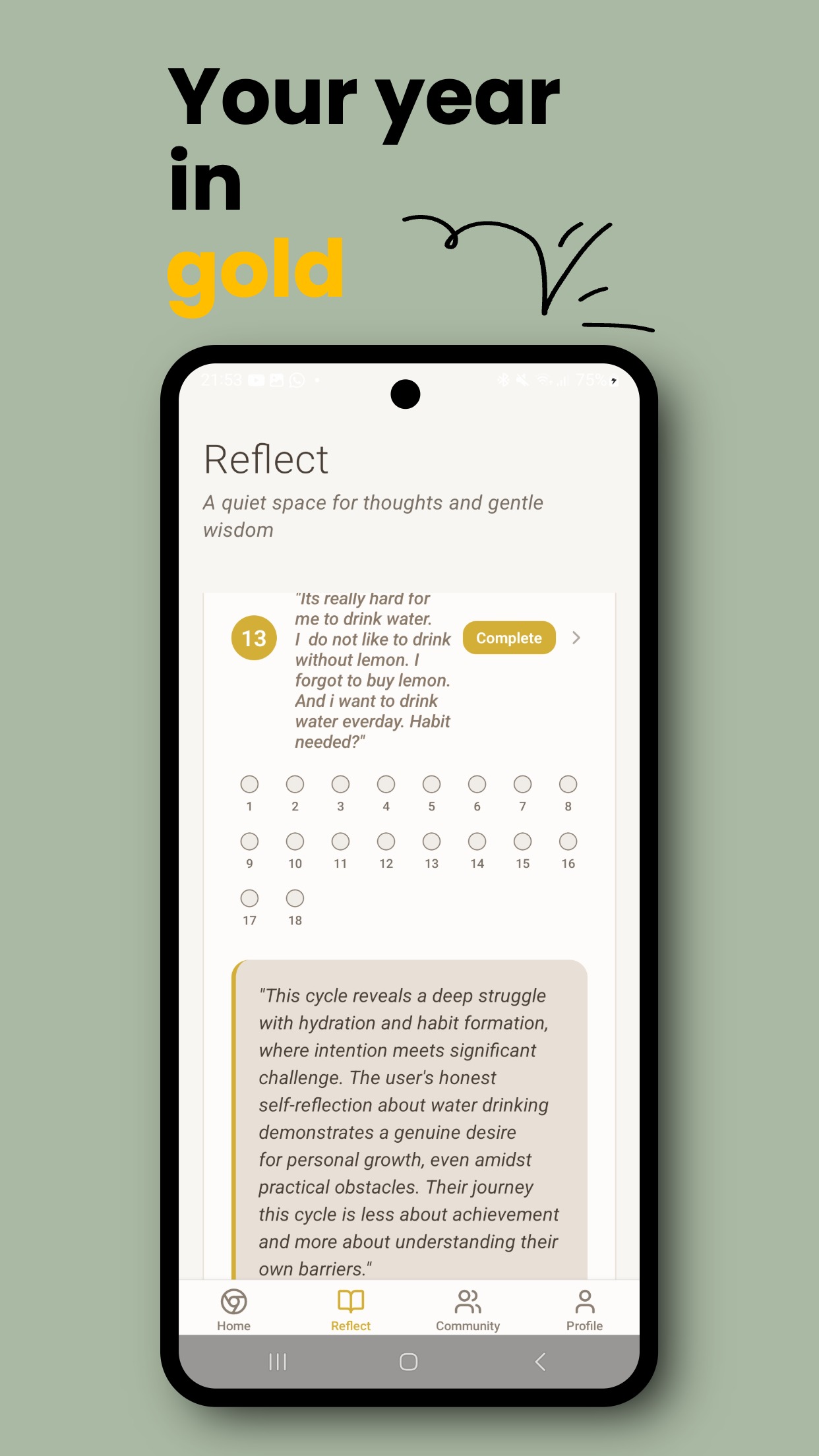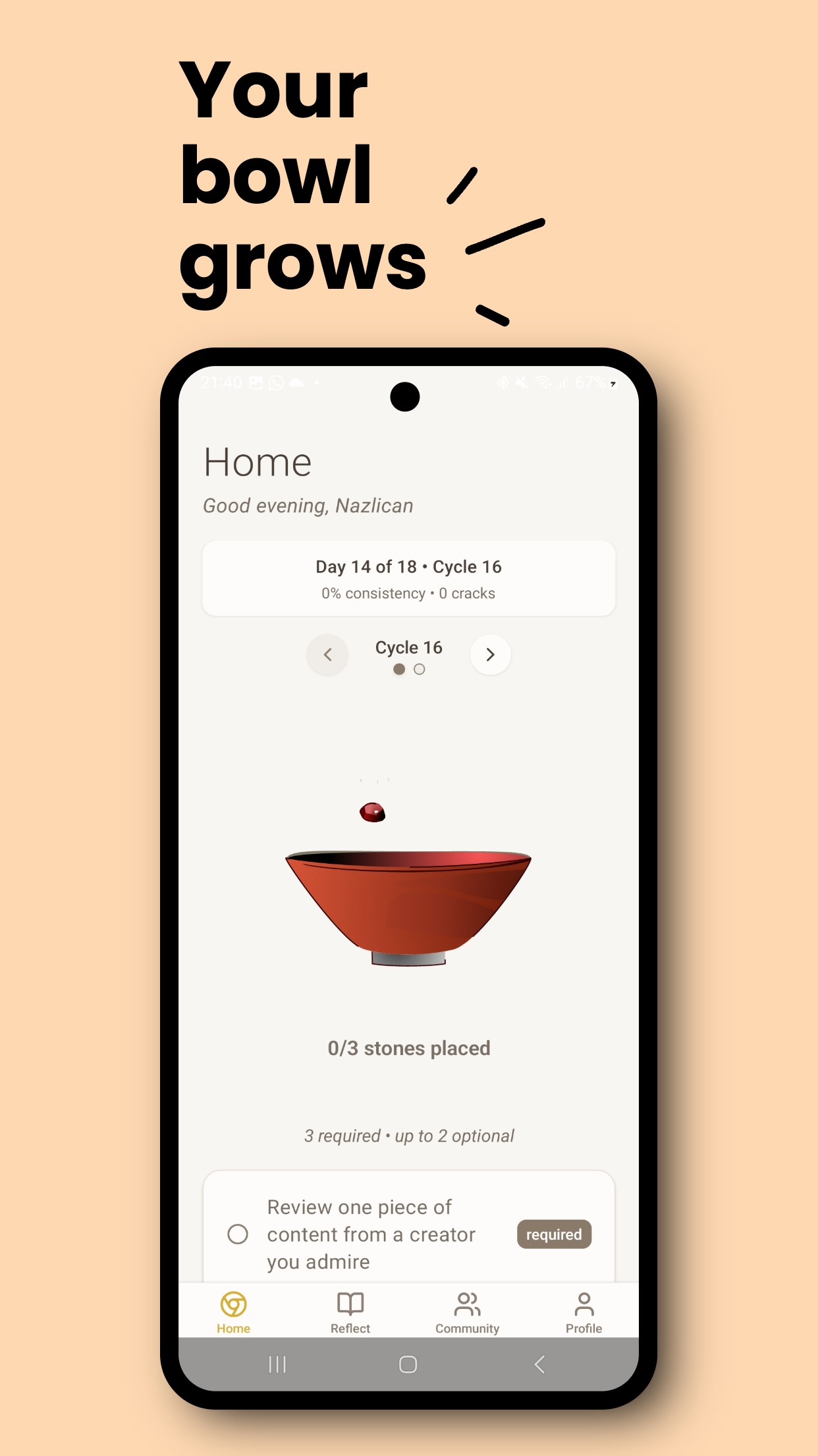 De cada vez que completa um hábito diário, uma pequena pedra é colocada numa taça virtual. Se não o conseguir completar como planeava, seja por apenas um dia ou por mais, a taça ganha fissuras. Mas, quando regressa, as fissuras são preenchidas com ouro, transformando o que poderia considerar uma falha, num símbolo não só de resiliência mas também de crescimento pessoal.