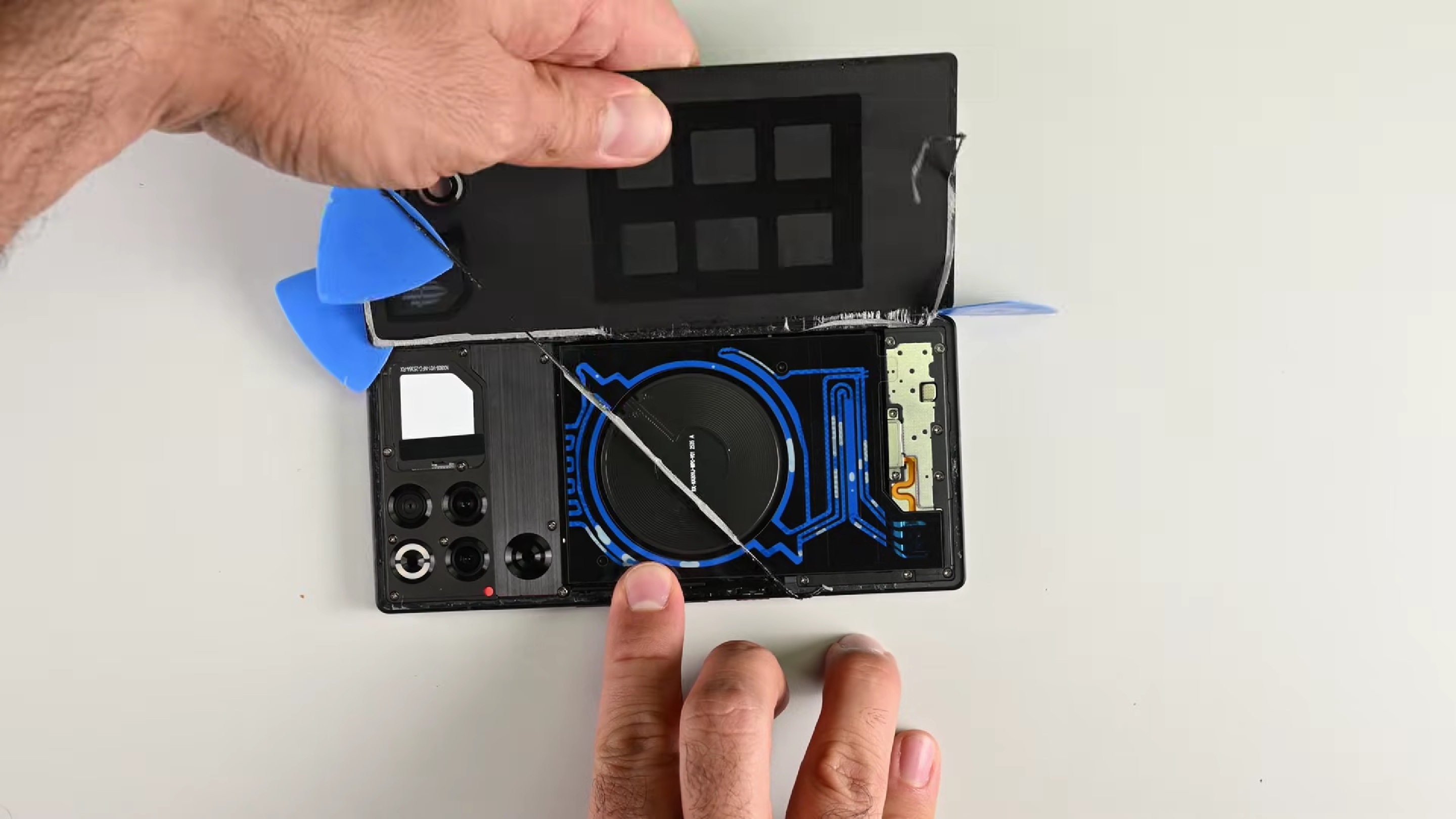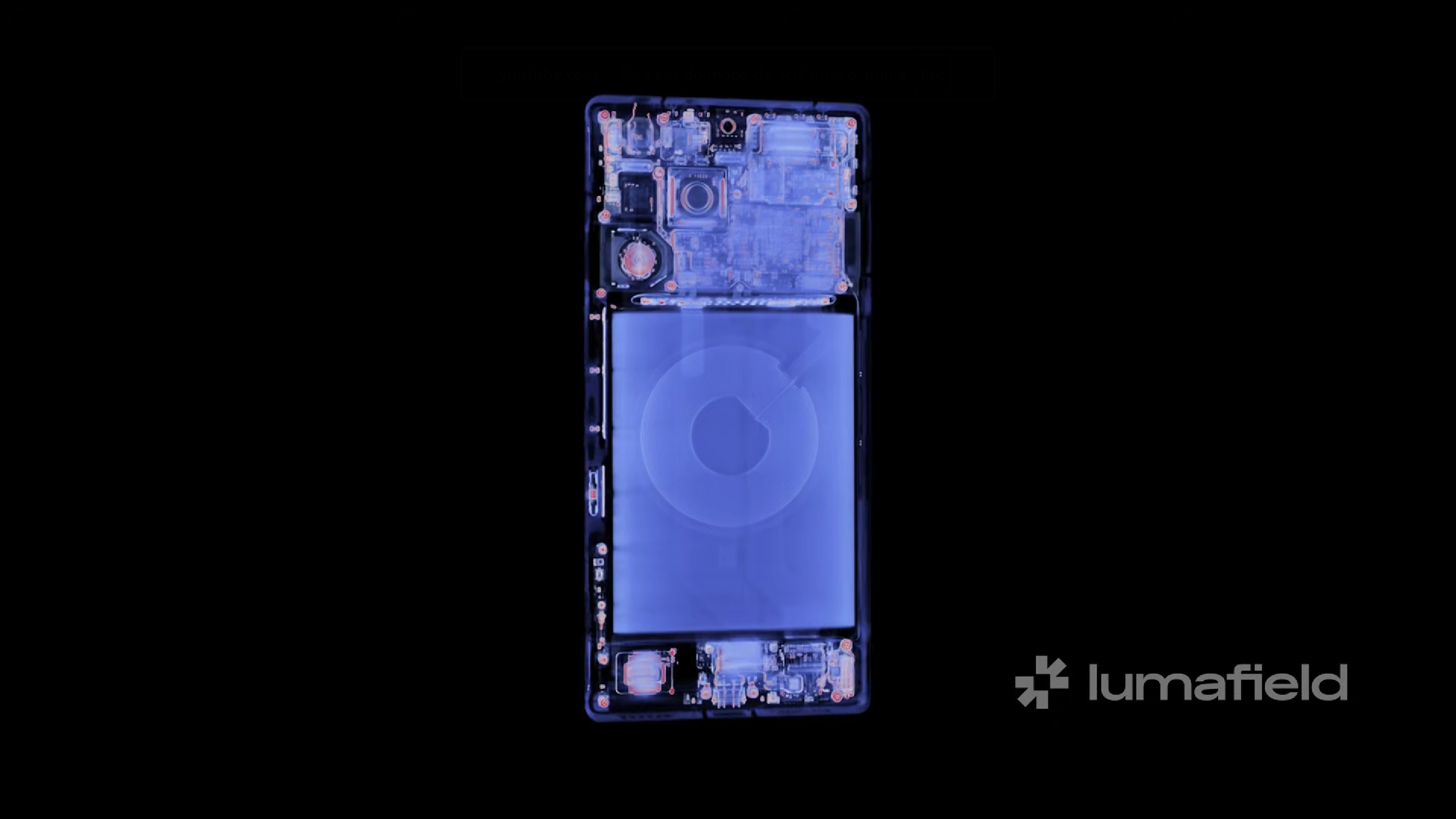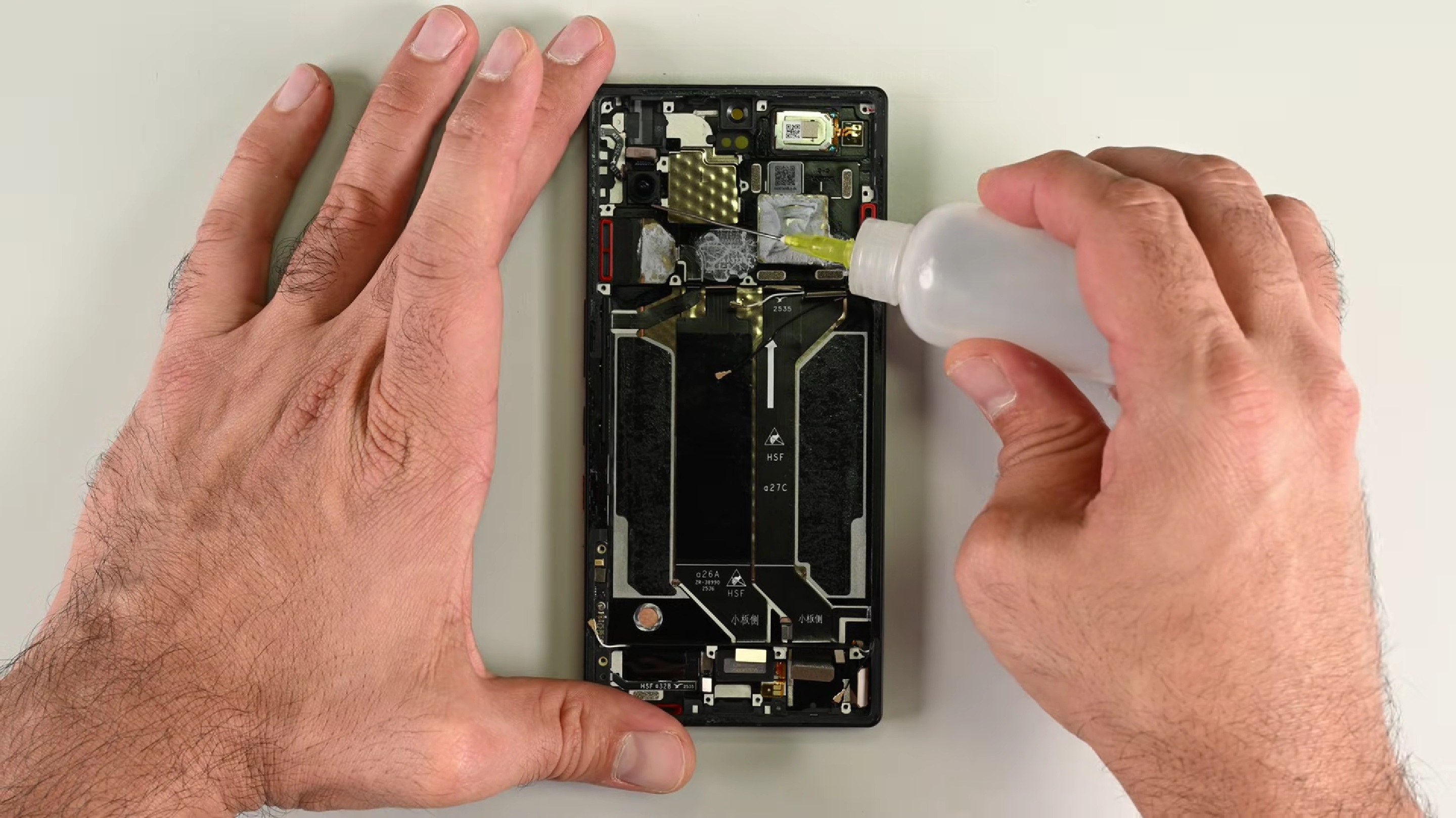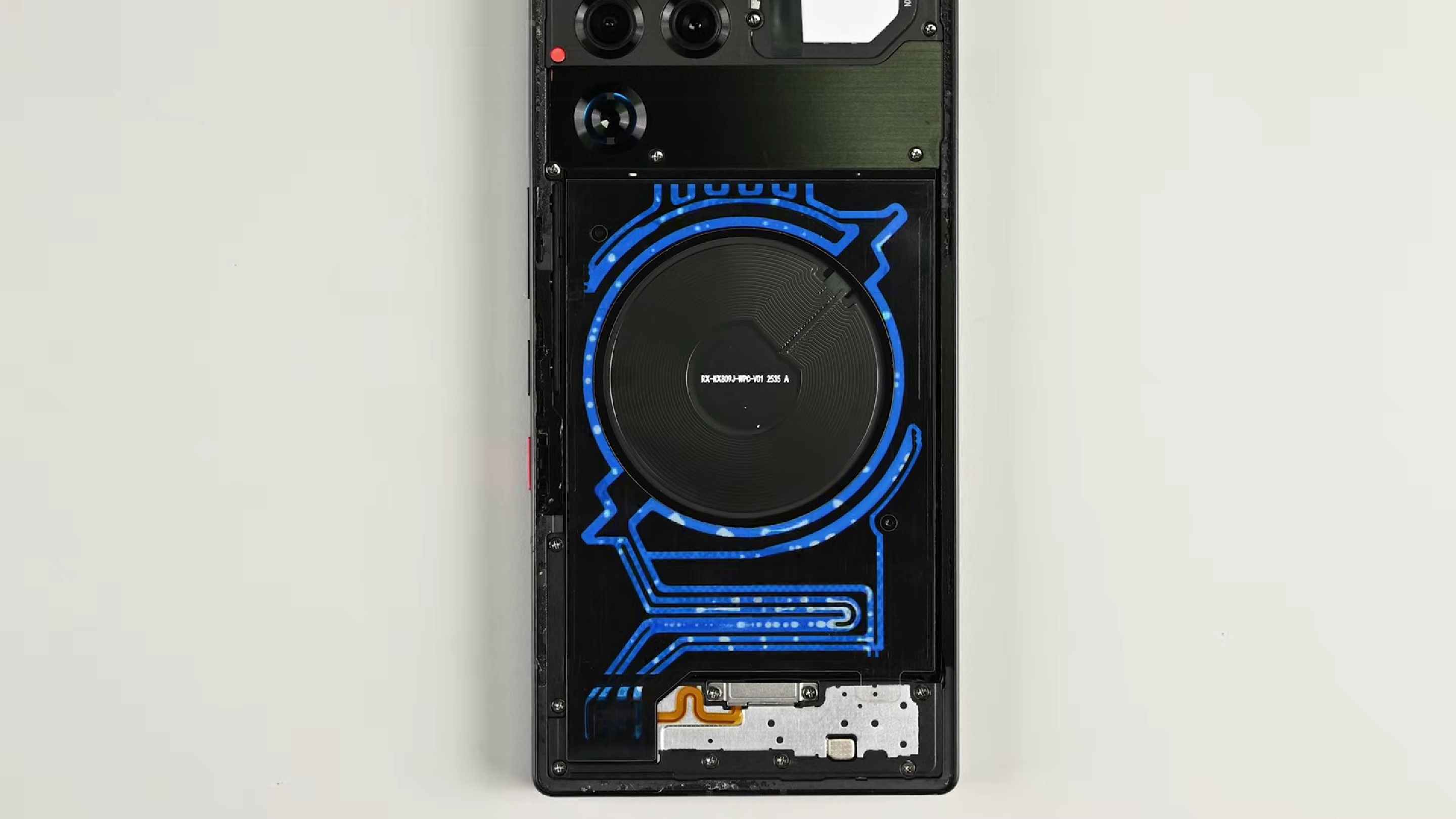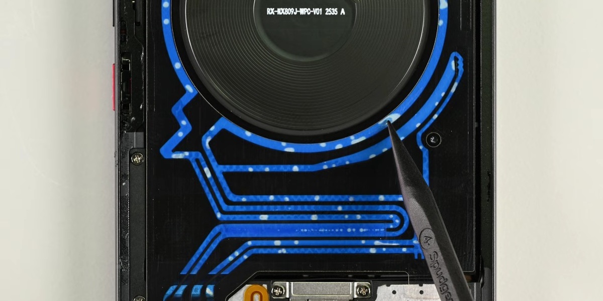 Depois de “espreitarem” o interior com ajuda da tecnologia de raios X da Lumafield, os especialistas começaram por remover o painel traseiro do RedMagic 11 Pro, revelando logo o mecanismo de arrefecimento líquido do smartphone, que rodeia a bobine de carregamento sem fios.