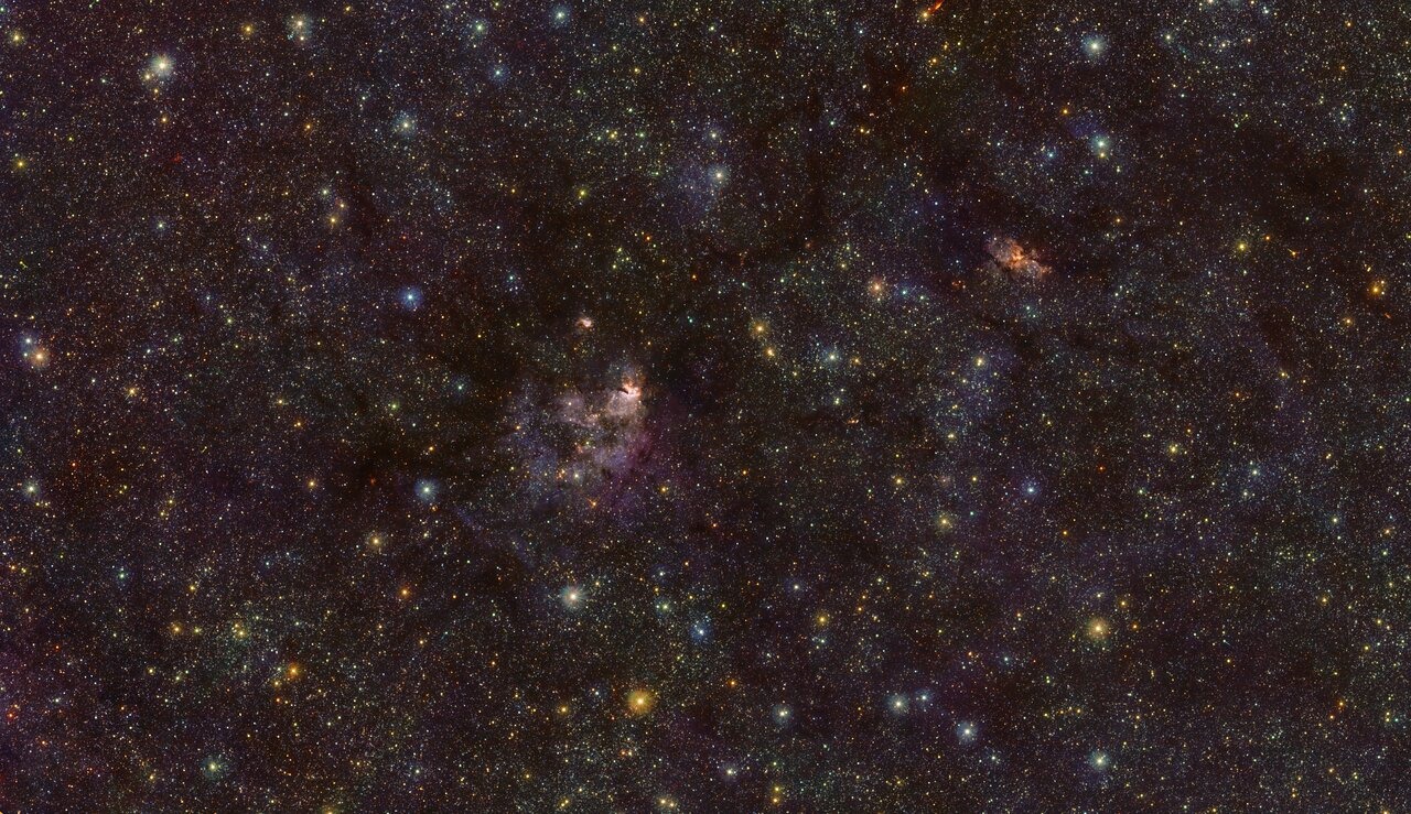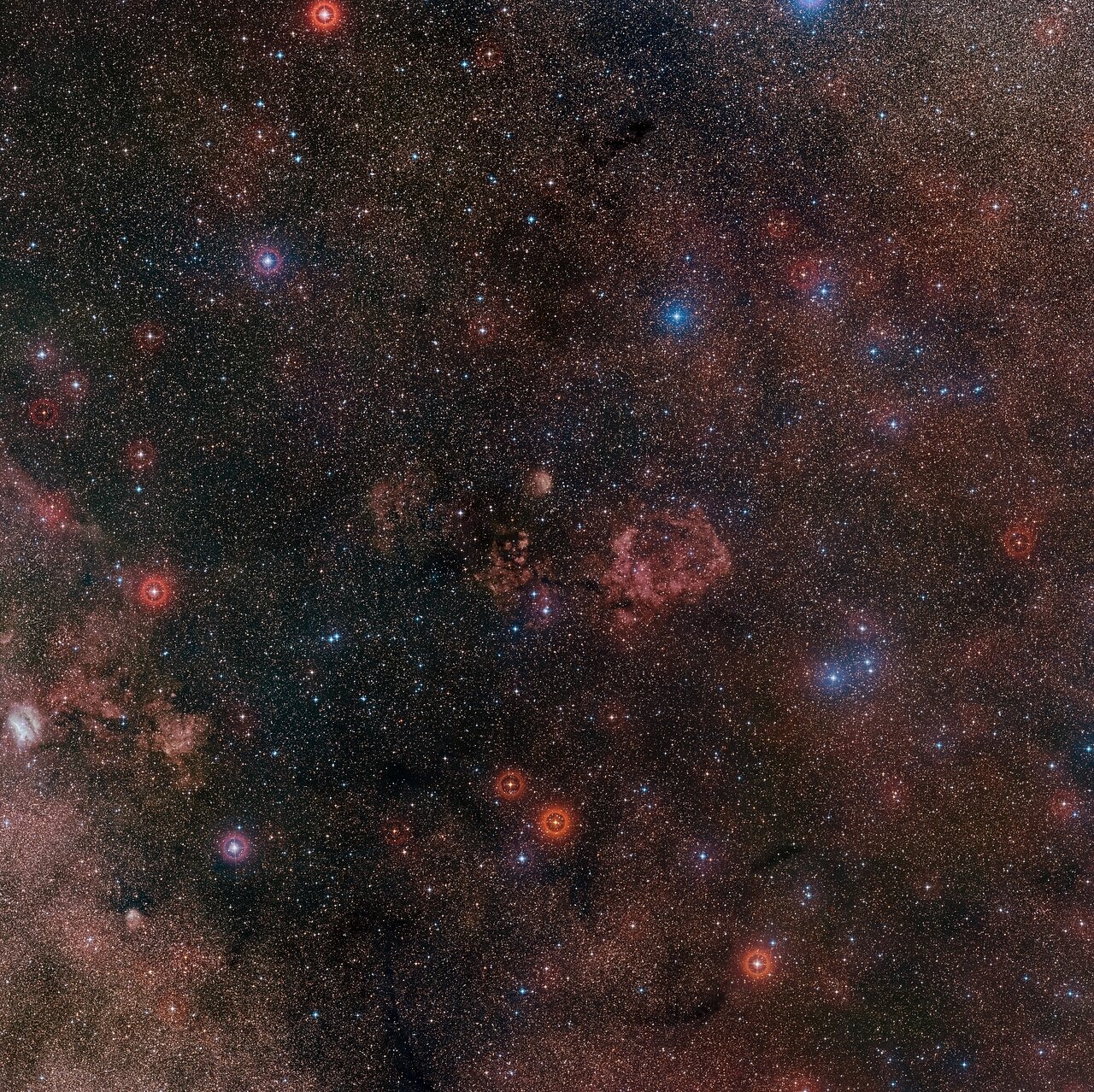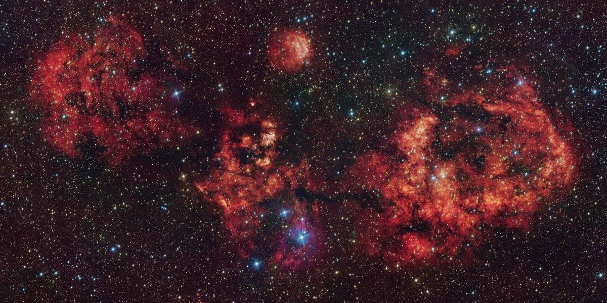 As nuvens mais proeminentes que surgem na imagem, que fazem parte de um extenso catálogo de regiões brilhantes de formação estelar do céu austral, são a RCW 94, que representa a asa direita do “morcego”, e a RCW 95, que forma o seu corpo.