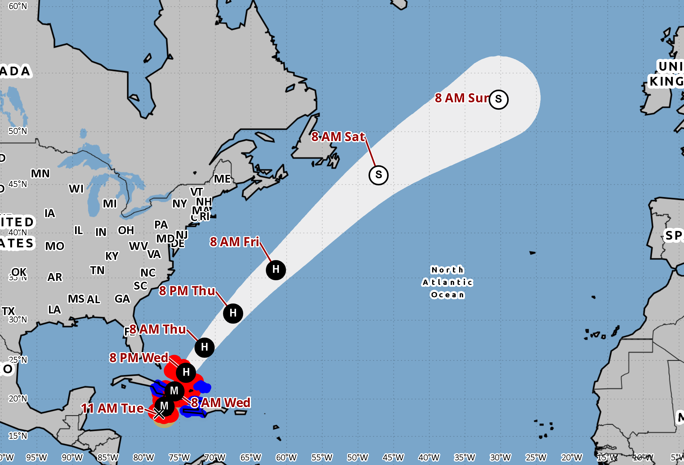 As ilhas vizinhas do Haiti, República Dominicana e de Cuba também vão ser atingidas pelo furacão, mas os avisos não são tão críticos, sendo esperada menor intensidade.