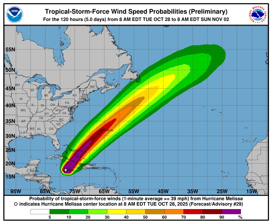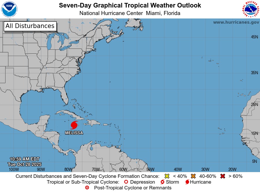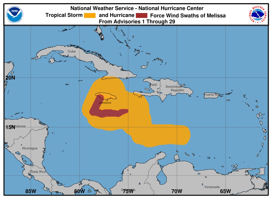 O Melissa foi classificado como um furacão de categoria 5 na escala Saffir-Simpson, o nível mais poderoso e destrutivo desta escala, podendo atingir ventos de 250 km/h. Aproxima-se da ilha da Jamaica e promete atingir com força o território, como se vê nas imagens de satélite que têm sido disponibilizadas pelo Centro Nacional de Furacões dos Estados Unidos (NHC).