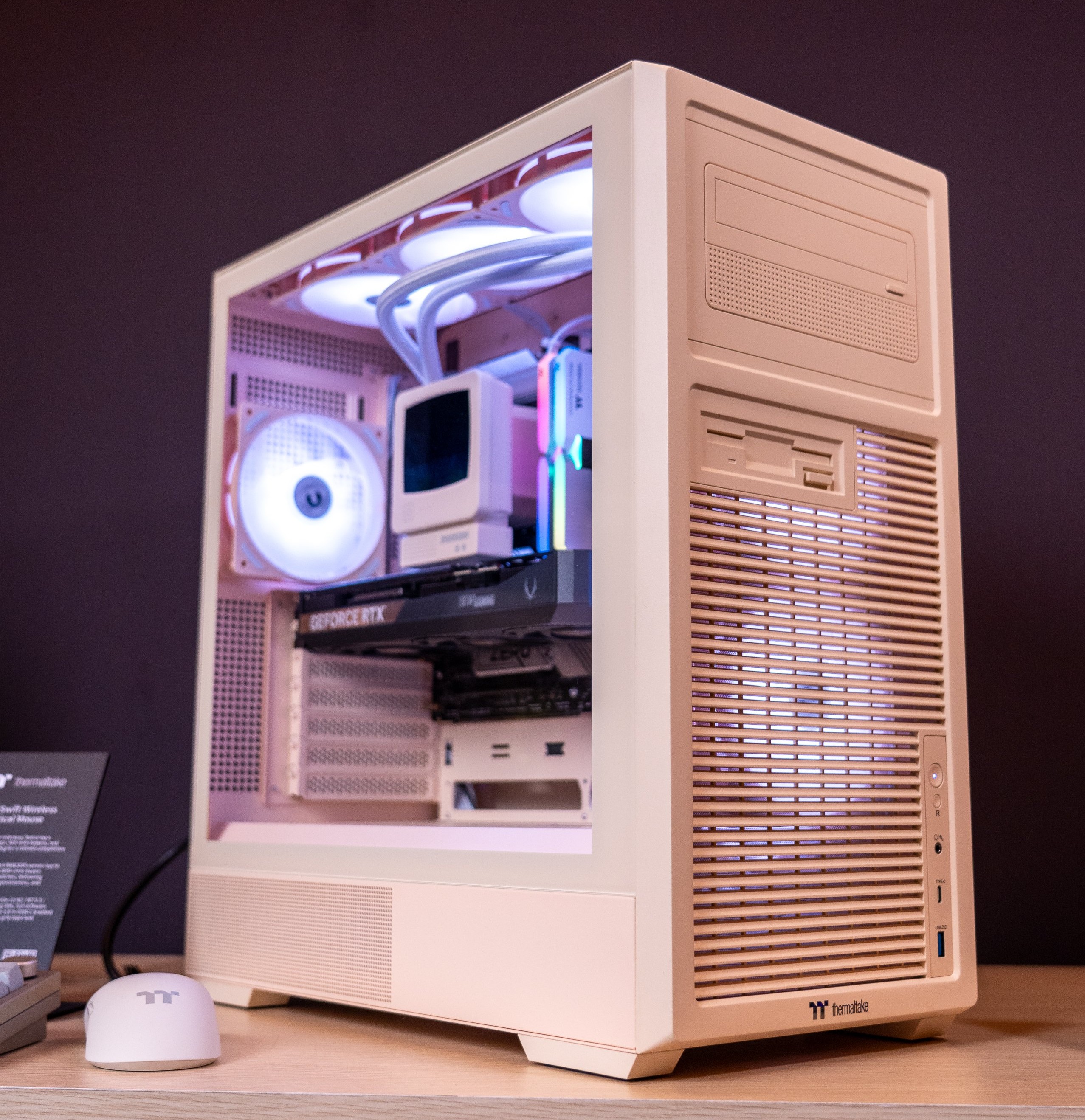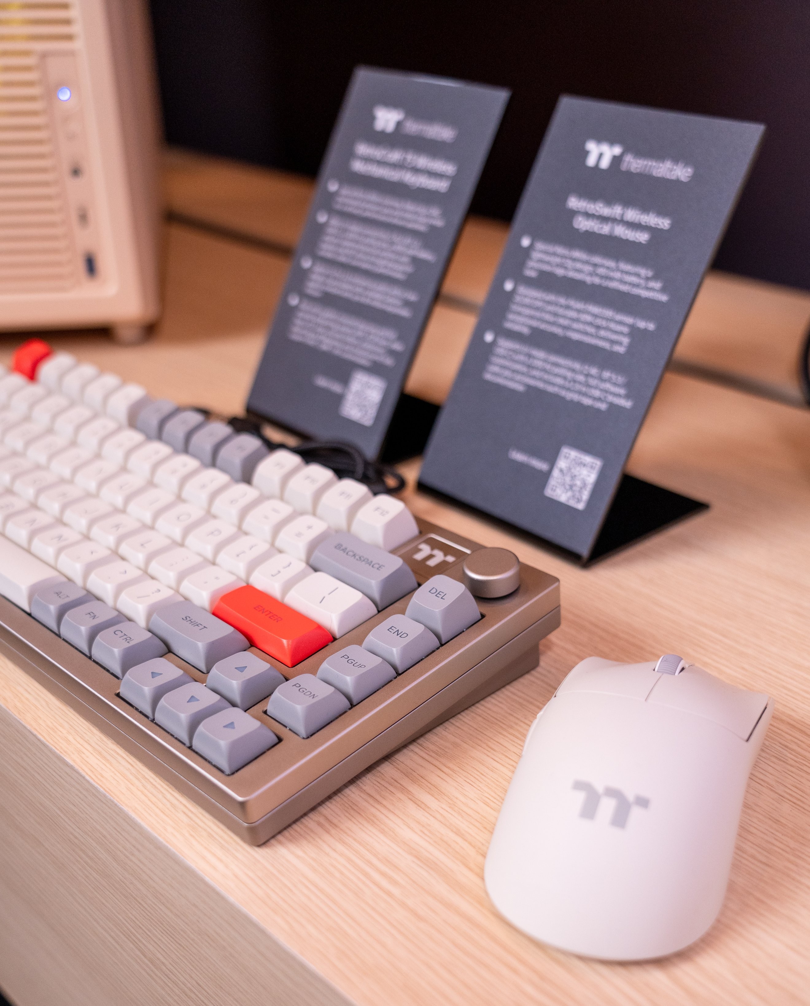 A Thermaltake não se ficou apenas pelas caixas e sistemas de refrigeração, alargando o tema retro a periféricos que complementam a estética nostálgica. O teclado RetroCraft apresenta um formato compacto de 75%, com interruptores mecânicos Gateron G-Pro 3.0, teclas em PBT com dupla injeção e multipla conectividade, por cabo USB, Bluetooth ou ligação Wireless de 2,4 GHz wireless. Já o rato RetroSwift, destaca-se pelo visual inspirado nas caixas retro, pelo sensor PixArt PAW 3395 de 26.000 DPI, com polling rate de até 1.000 Hz, e apenas 52 gramas.