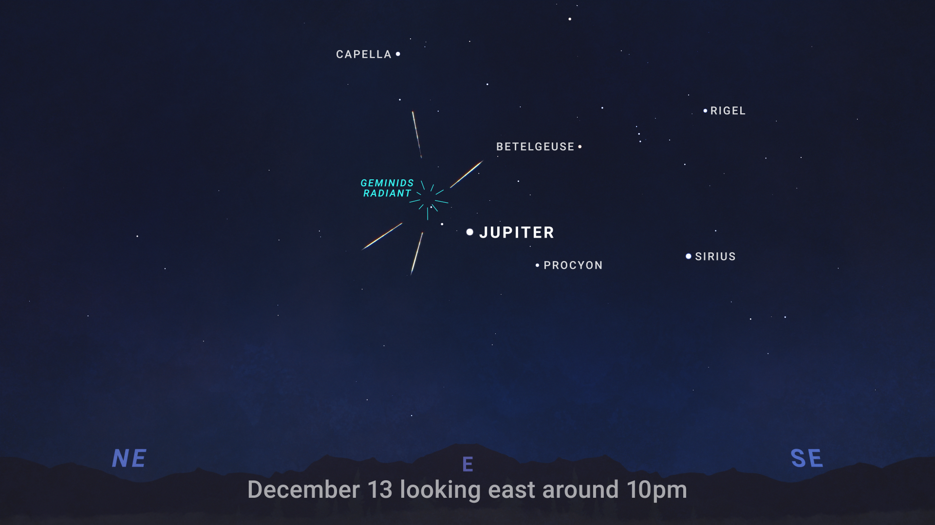 Já entre os dias 13 e 14 de dezembro, a chuva de estrelas das Geminidas vai atingir o seu pico. Esta chuva de meteoros é conhecida pelo seu brilho e cores intensas e resulta dos detritos deixados pelo asteroide 3200 Faetonte.