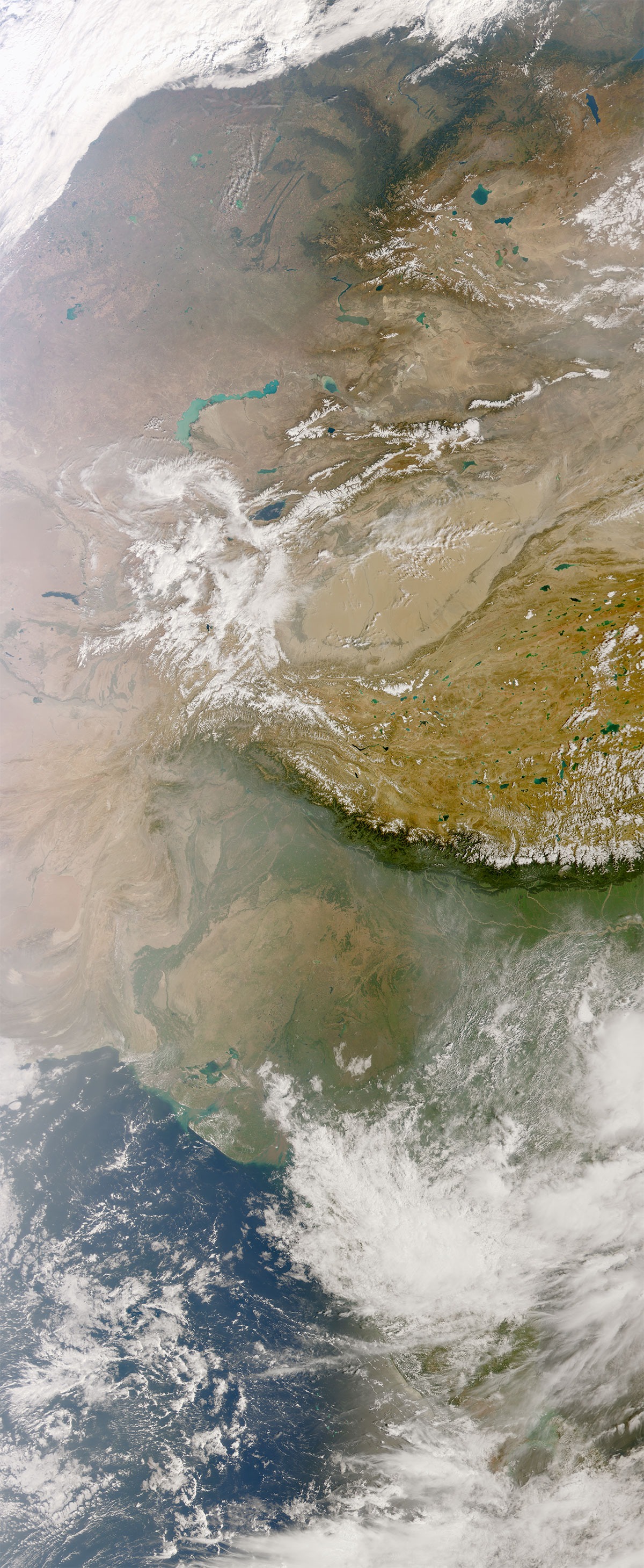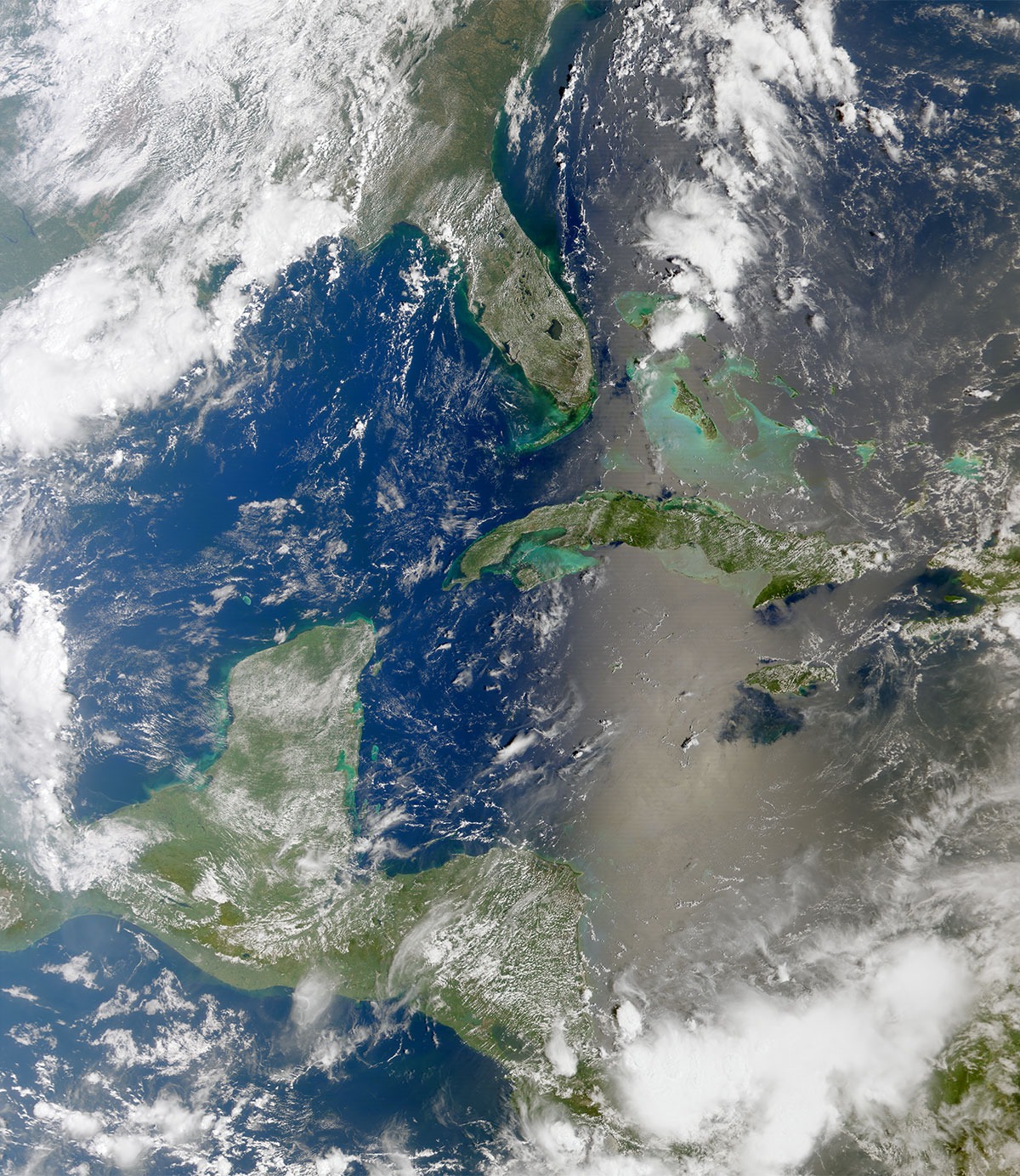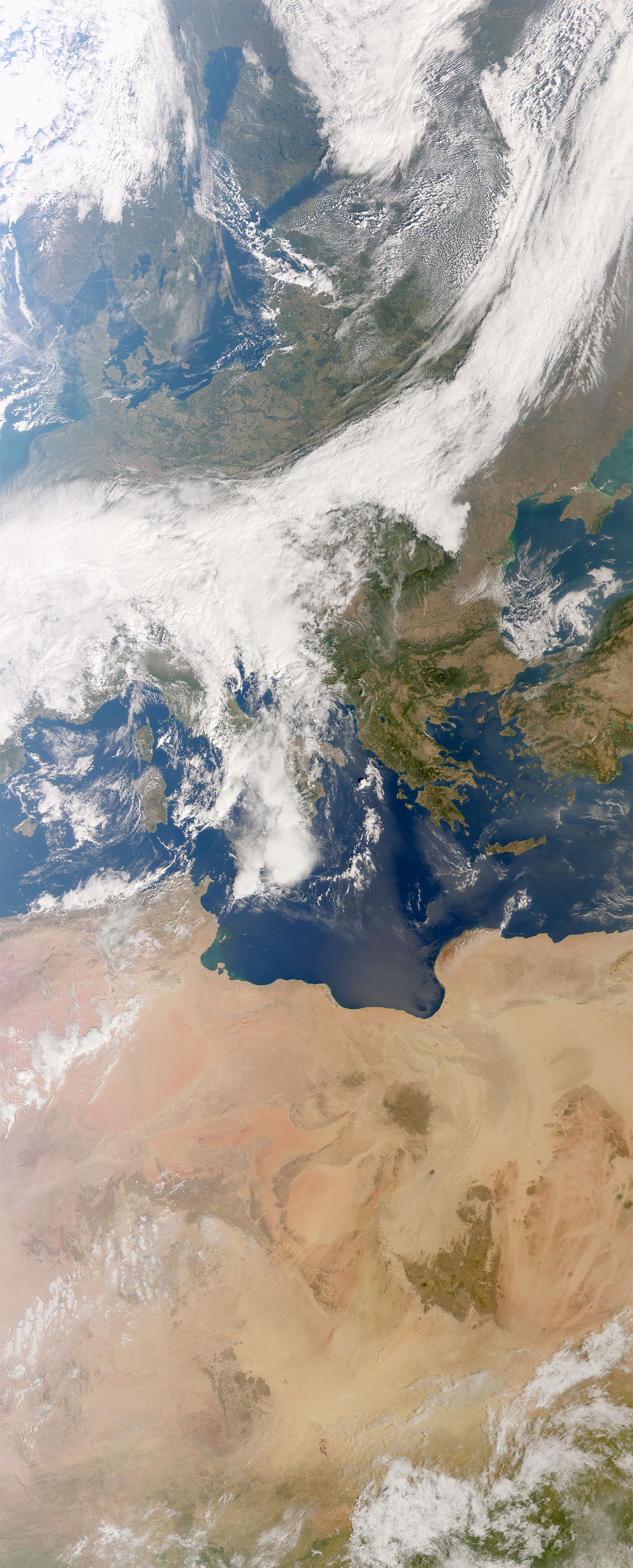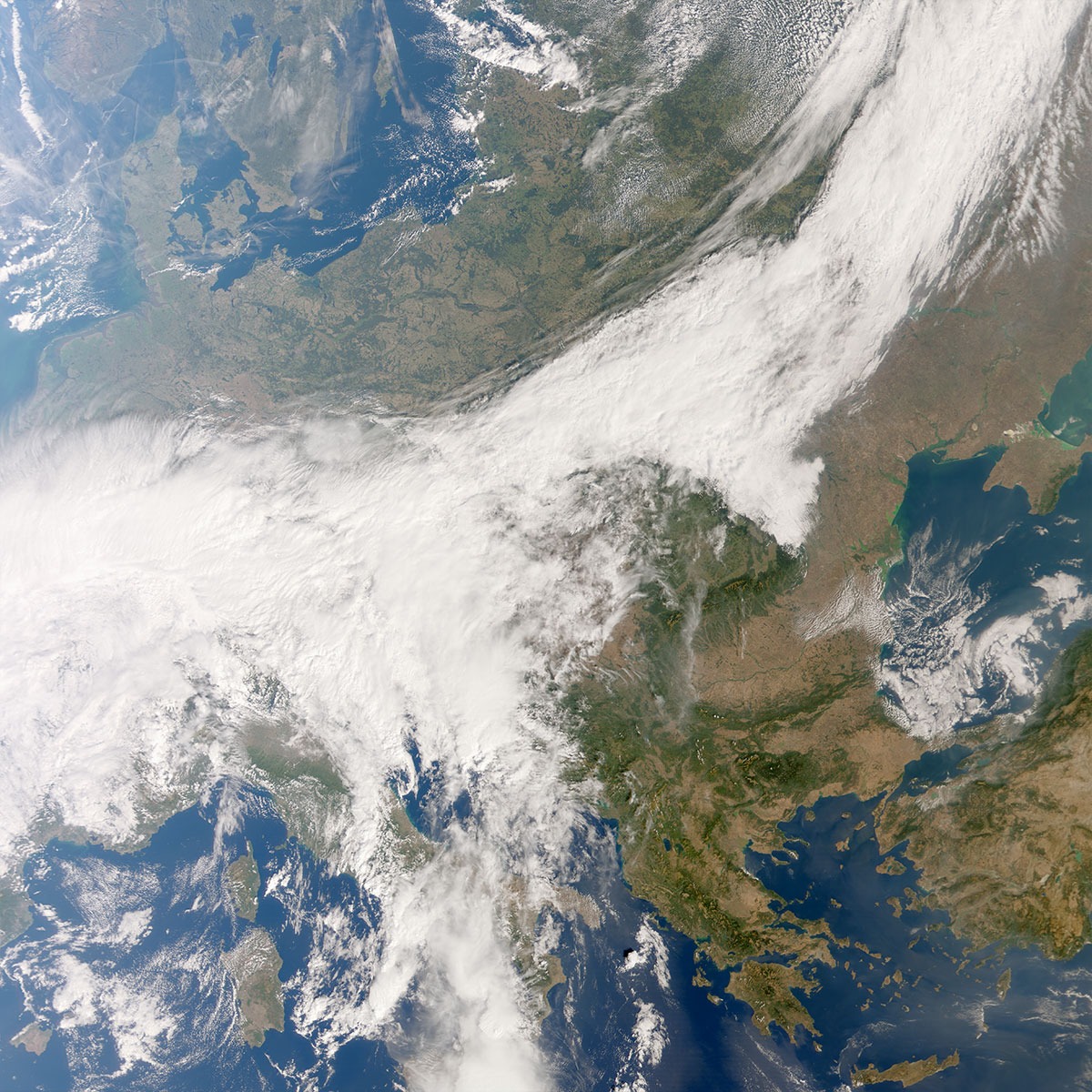 Nesta imagem surgem também céus limpos que deixam observar as florestas nas montanhas dos Cárpatos e dos Balcãs, lagos brilhantes na Turquia e o contraste entre os desertos no norte de África e zonas mais verdes.