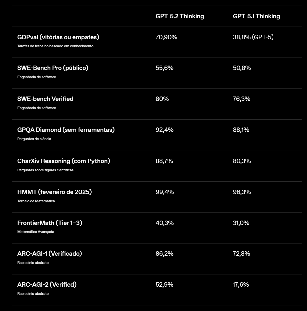 O GPT-5.2 Thinking alcançou, por exemplo, pontuações elevadas no GDPval, um benchmark da OpenAI que compara o desempenho entre modelos de IA e profissionais humanos em 44 profissões do mundo real. De acordo com a empresa de Sam Altman, o modelo conseguiu superar especialistas humanos em mais de 70% das tarefas, concluindo as tarefas 11 vezes mais rápido.