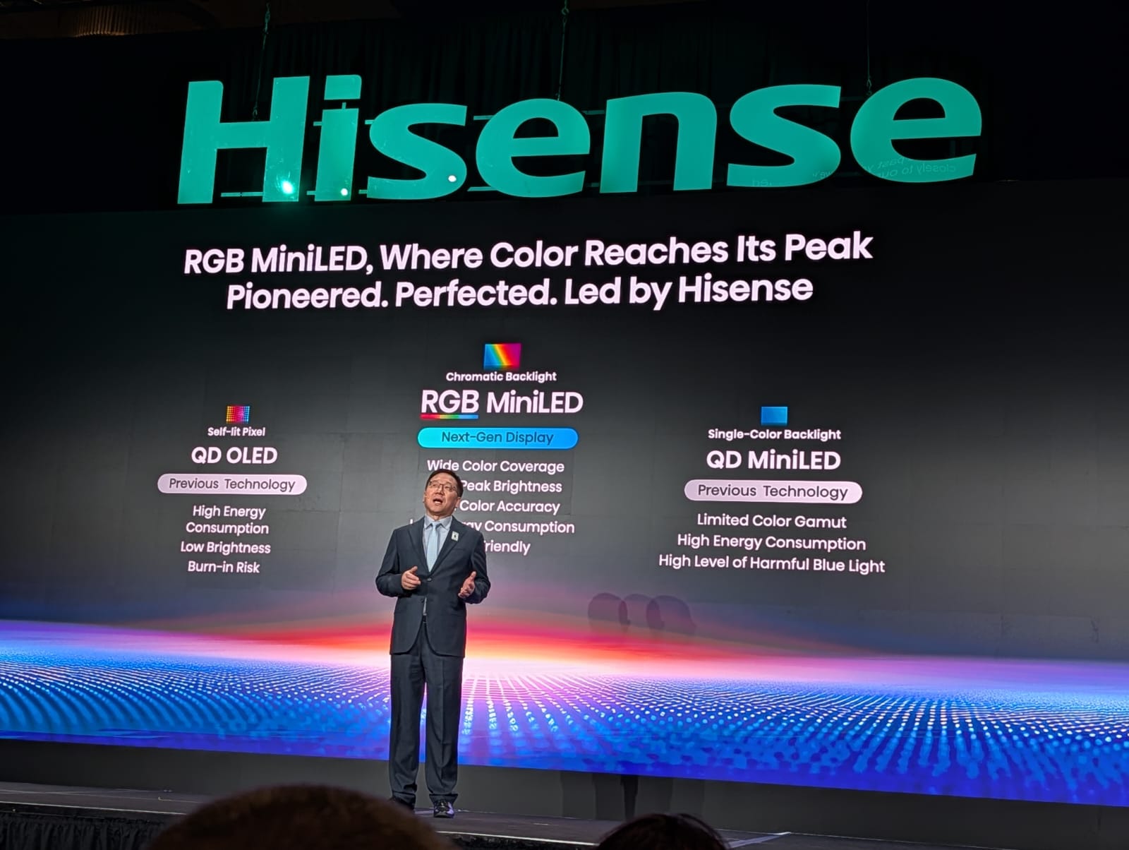 “Há um ano lançámos o RGB MiniLED, fomos pioneiros […] o nosso objetivo é levar a cor pura ao limite e queremos ser os primeiros na era do ecrã de full colour”, afirmou Dennis Li.