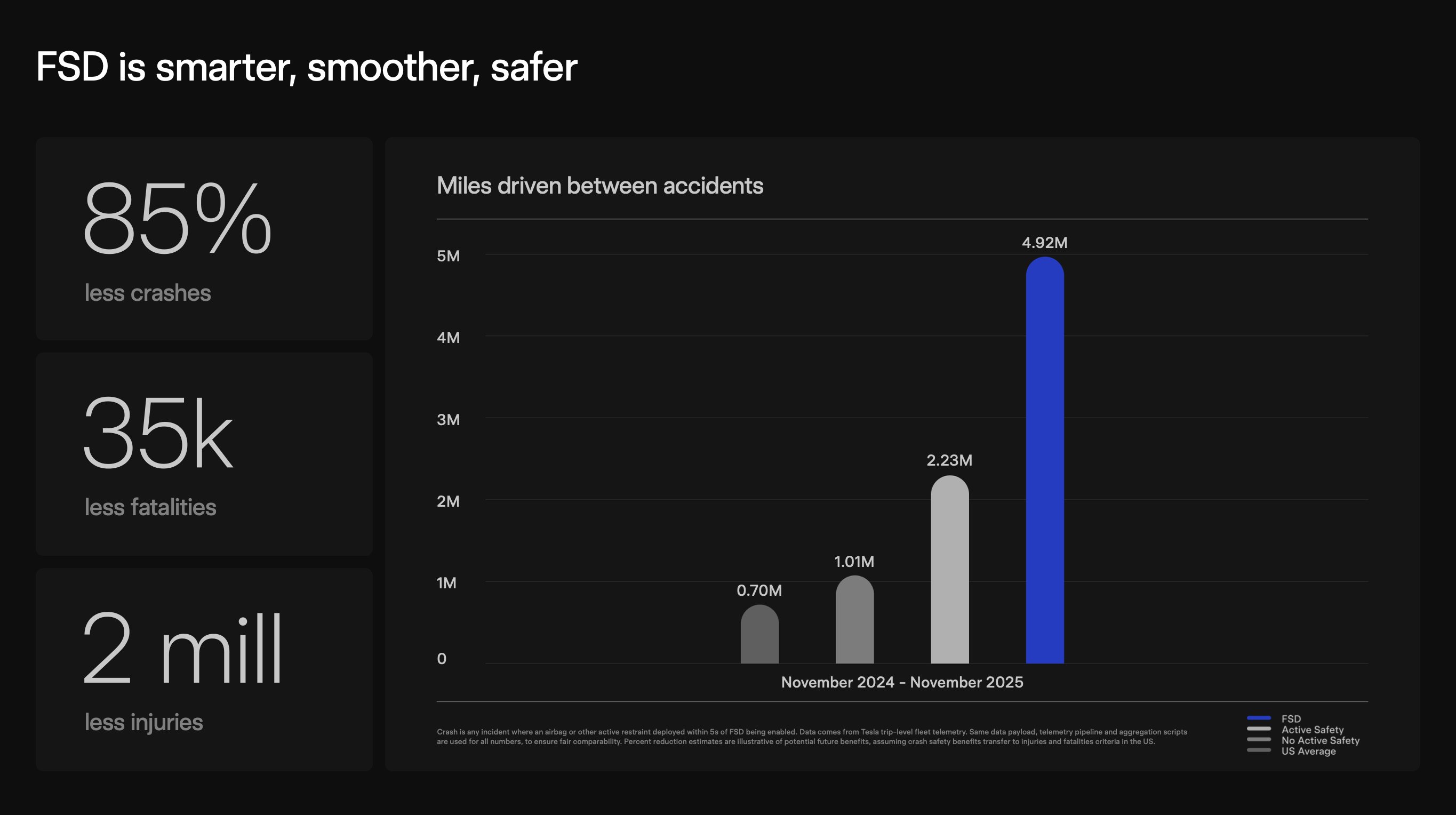 Segundo esses dados de telemetria recolhidos, durante novembro de 2024 e novembro de 2025, os veículos Tesla equipados com o sistema FSD ativo registaram uma média de 4,92 milhões de milhas percorridas entre acidentes, um valor que contrasta com os 2,23 milhões para veículos equipados apenas com sistemas de segurança ativa, 1,01 milhões para veículos sem quaisquer sistemas de segurança ativa, e apenas 0,70 milhões de milhas para a média nacional dos Estados Unidos.