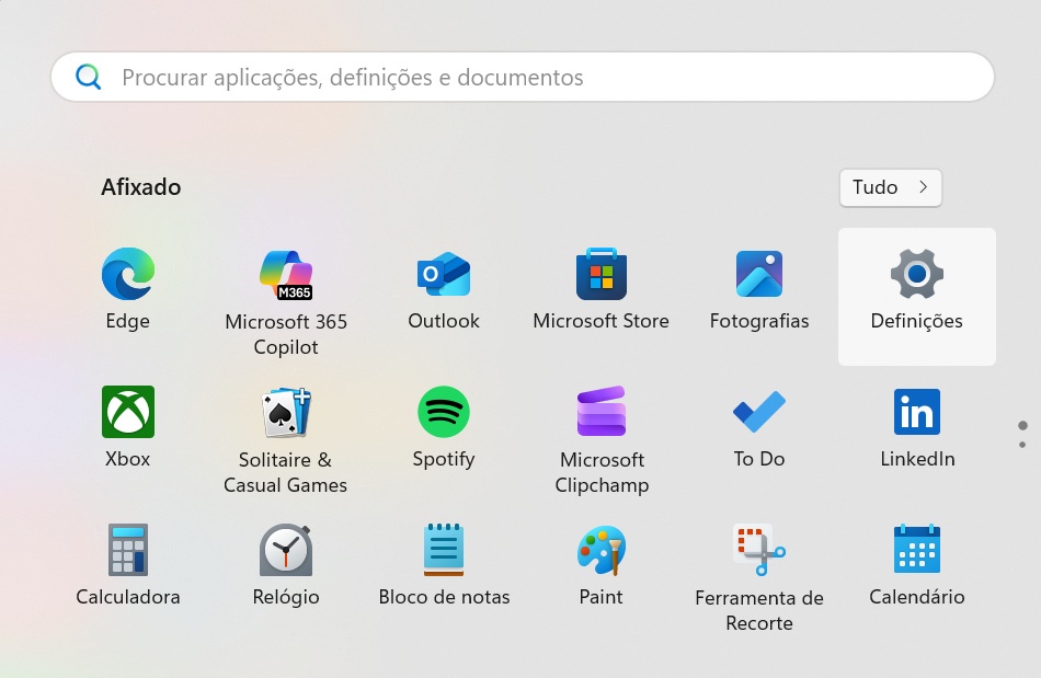 1 – Através do menu Iniciar, aceda às “Definições” (Settings) do seu computador;