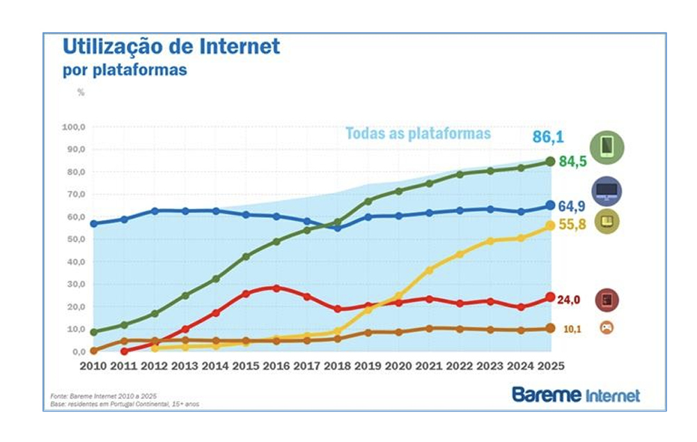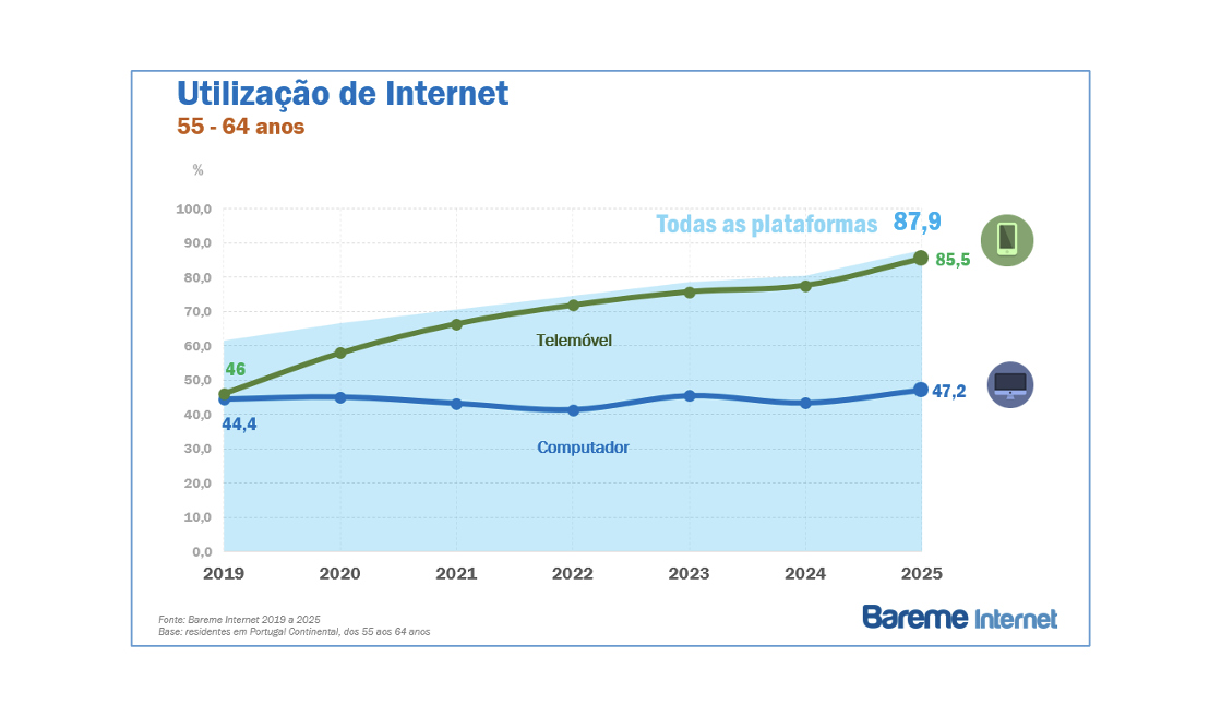 O relatório aponta, como exemplo, que em 2019, a utilização de internet no telemóvel por este grupo etário estava nos 46%. Já a utilização de internet em geral, independentemente do equipamento, neste mesmo escalão etário, estava nos 61%, o que corresponde a uma diferença de 15,4%. Se olhar para 2025, essa diferença é de apenas 2,5%, sendo que o uso de internet em geral nesta faixa etária é de 87,9%.