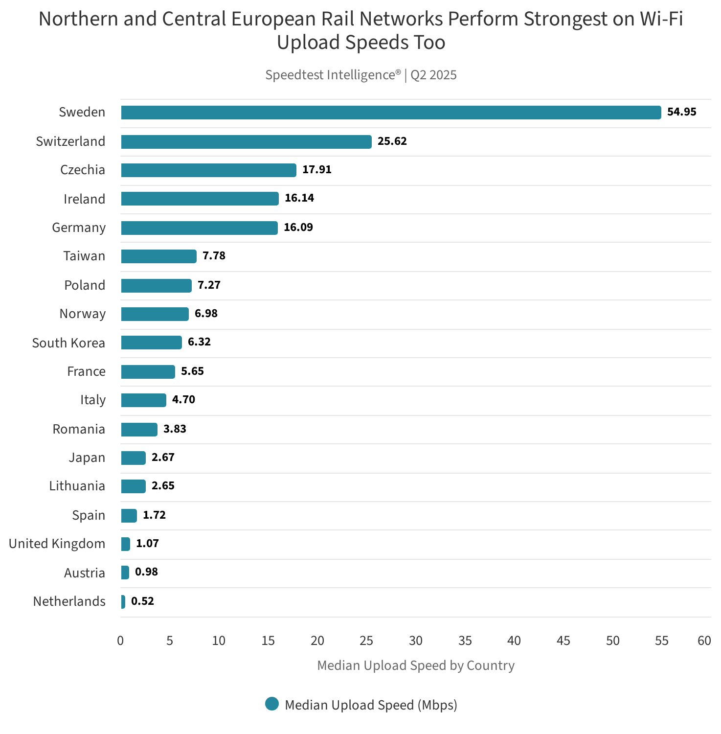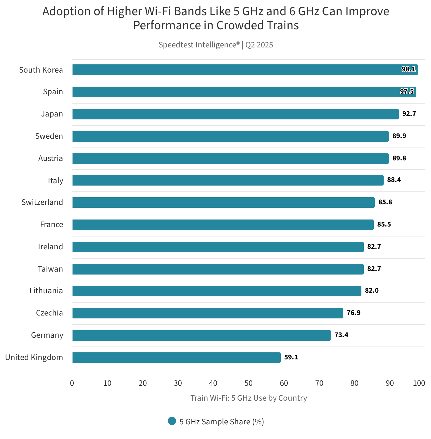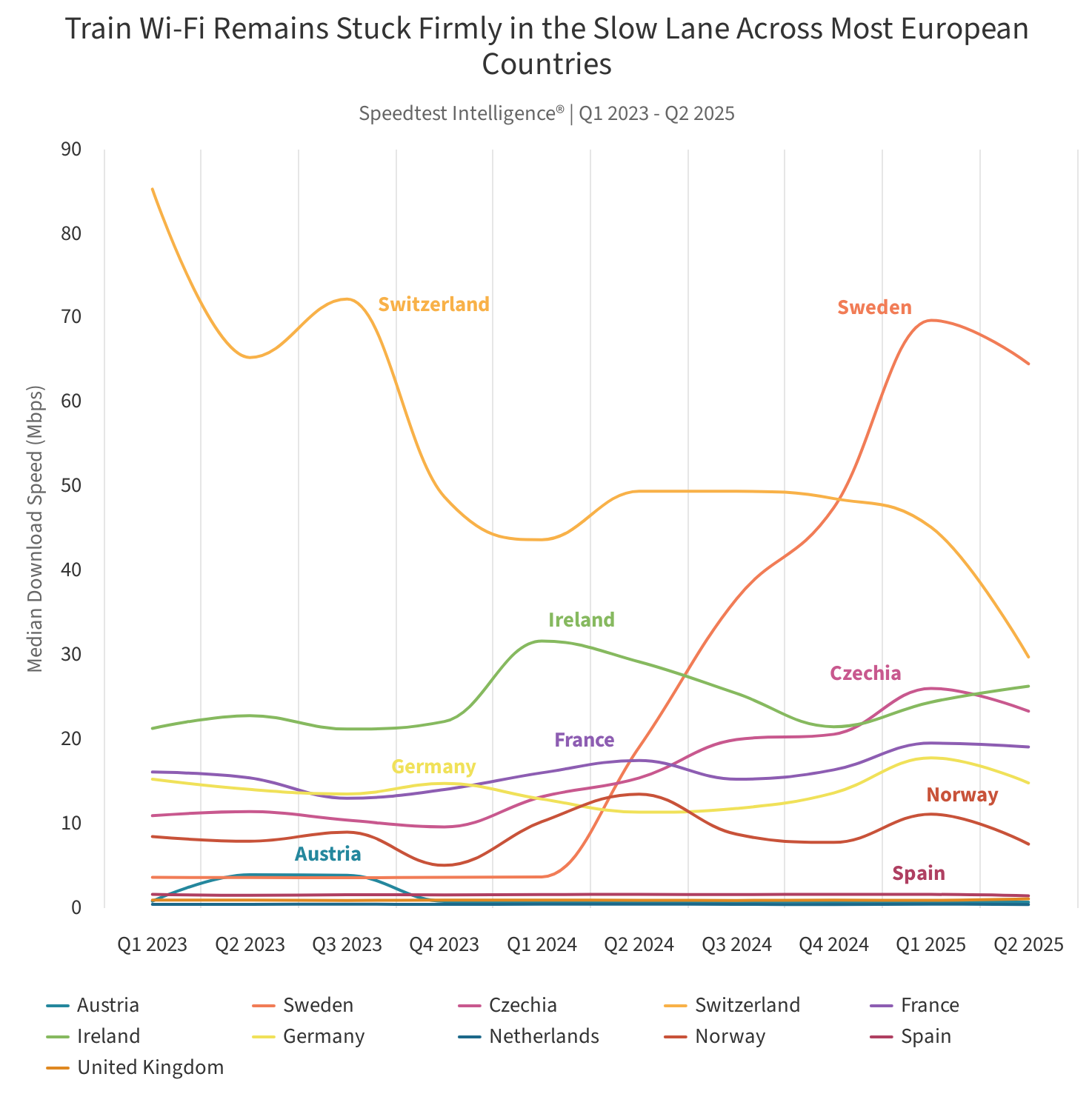 A empresa diz que os países tratam a conectividade dos comboios como infraestrutura dos caminhos de ferro, emparelhando o Wi-Fi a bordo com a respetiva infraestrutura, utilizando linhas da ferrovia ou satélite LEO (ou ambos), com melhorias ao longo do tempo. Para o estudo, a empresa utilizou os dados dos utilizadores (crowdsource) através da ferramenta de benchmark Speedtest para testar o nível de performance do Wi-Fi dos comboios a nível dos países entre a Europa e a Ásia. Infelizmente Portugal ficou de fora do estudo.