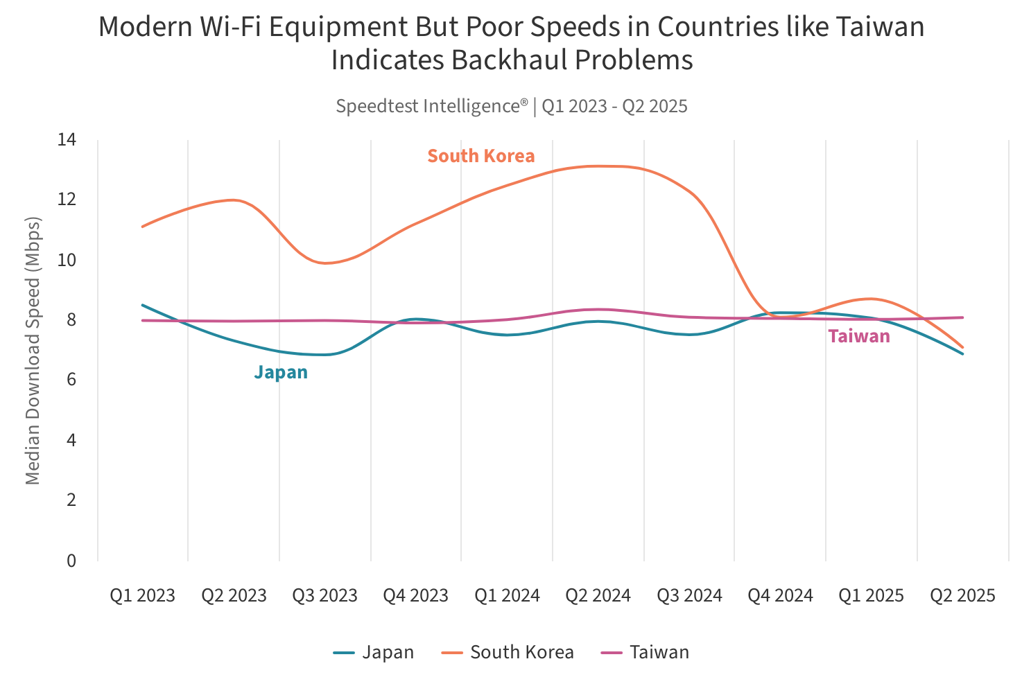 A linha ferroviária asiática oferece um mix moderno e menor latência, mas não são sempre as mais rápidas. O Taiwan tem a latência mais baixa e a única com uma quota de 20% de Wi-Fi 6, enquanto o Japão e a Coreia do Sul não aparecem sequer registos de utilização em Wi-Fi 4 e frequência de utilização em 2,4 GHz. Mas a média típica da velocidade de download na Ásia é de 6-8 Mbps, muito abaixo da liderança da Europa, mas acima dos menos rápidos. A Ookla diz que isso se deve a diferenças de políticas de abordagem, com maior ênfase na rede celular do que no Wi-Fi, aponta o relatório.