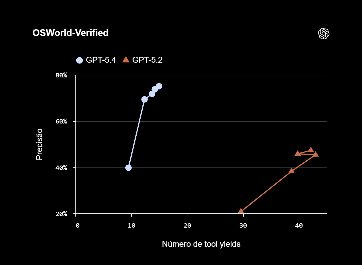Graças a estas novas capacidades, o desempenho e a flexibilidade do modelo melhoraram significativamente, algo que pode ser comprovado pelos benchmarks que testam a utilização do computador em diferentes contextos. No OSWorld-Verified, que mete a capacidade do modelo em navegar num ambiente de desktop através de capturas de ecrã e ações de teclado e rato, a taxa de sucesso subiu de 47,3% do GPT-5.2 para 75%. Relativamente ao WebArena Verified, que regista a capacidade de navegação na web, esta melhorou somente de forma ligeira, de 65,4% para 67,3%.