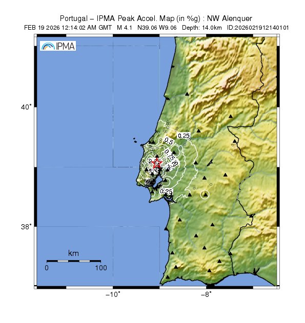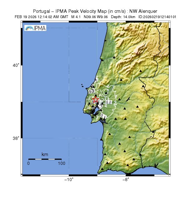 A informação básica na página do Instituto Português do Mar e da Atmosfera (IPMA) dava conta de que "no dia 19-02-2026 pelas 12:14 (hora local) foi registado nas estações da Rede Sísmica do Continente, um sismo de magnitude 4.1 (Richter) e cujo epicentro se localizou a cerca de 4 km a Oeste-Noroeste de Alenquer". Dois minutos depois foi registado um segundo sismo, pelas 12h16, com a mesma intensidade, mas essa informação não chegou a ficar logo publicada no site e era visível apenas na aplicação sismos@ipma.