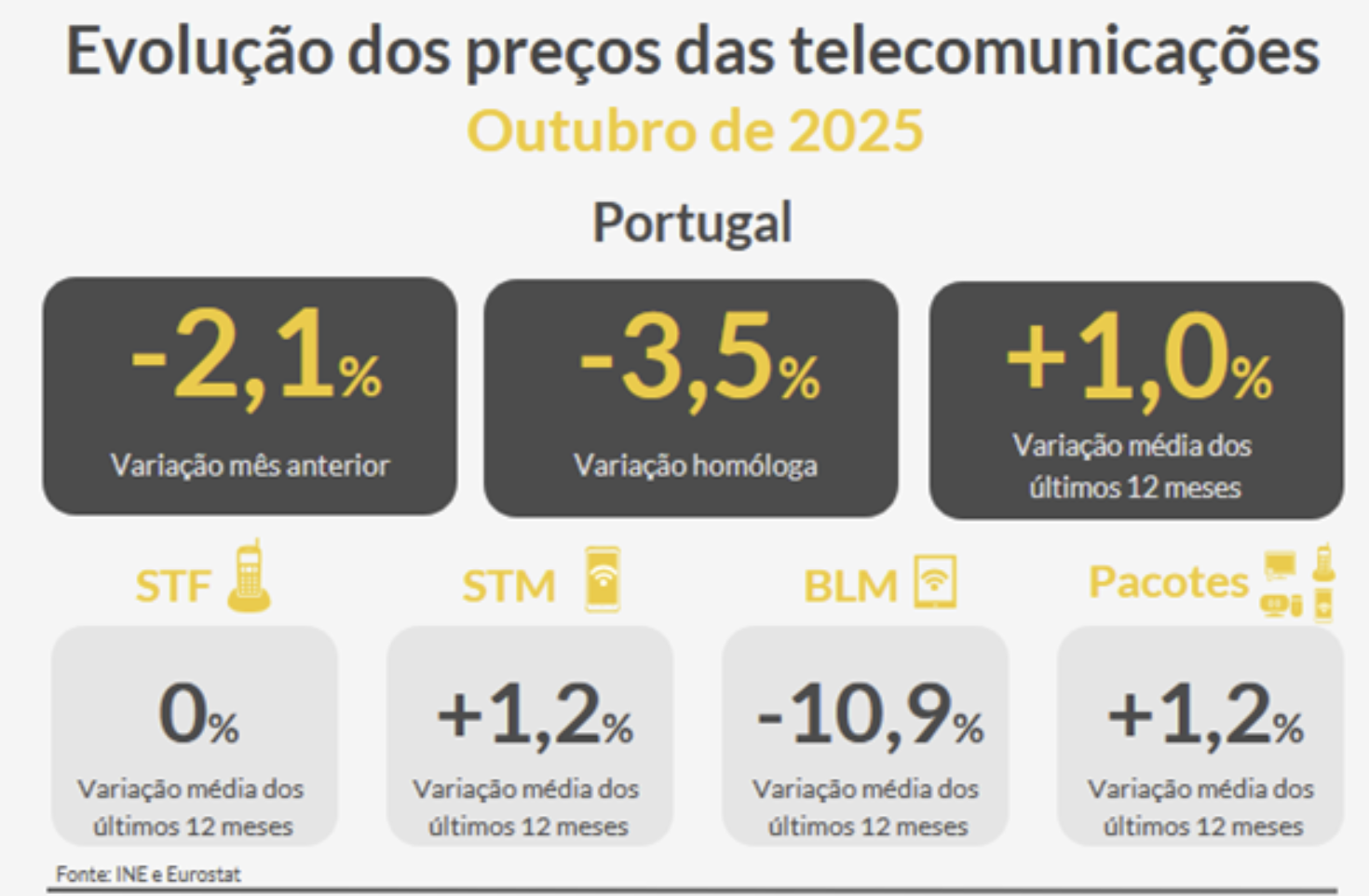 Segundo os dados do Eurostat, por tipo de serviços, a taxa de variação média dos últimos doze meses em Portugal foi 1,2%, tanto nos serviços disponibilizados em pacote como nos serviços telefónicos móveis. Mesmo assim ficou acima da registada na União Europeia, onde a taxa foi de -1,3%.