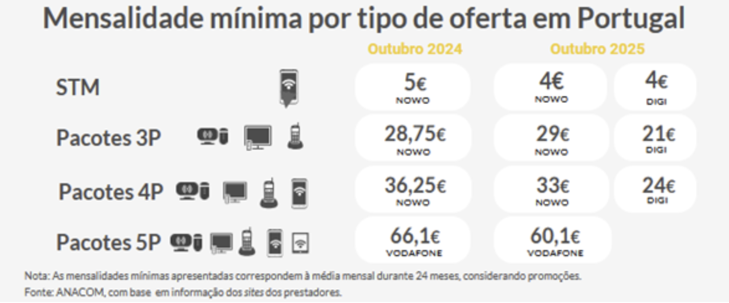 À semelhança do que tinha acontecido em períodos anteriores, a Digi tinha em outubro a mensalidade mínima mais baixa para nove tipos de oferta, num leque de 11 serviços ou ofertas analisados. Na lista estão o serviço telefónico móvel (STM) stand alone (4 euros) e os pacotes triple play (21 euros) e quadruple play (24 euros).