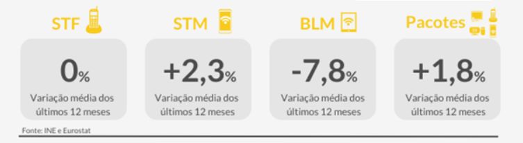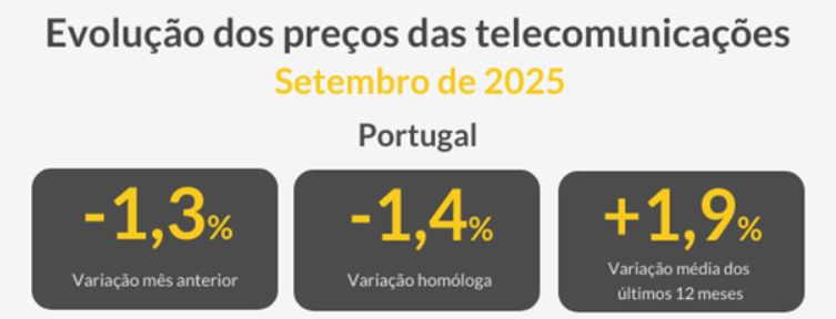 Face à média europeia, os números mostram que nos últimos 12 meses a variação média dos preços das comunicações em Portugal foi superior à da UE em 3,4 pontos percentuais, com o país a registar a 13ª variação de preços mais elevada entre os países da UE a 27. Em Portugal atingiu 1,9% e na UE a variação média foi negativa, em 1,5%.