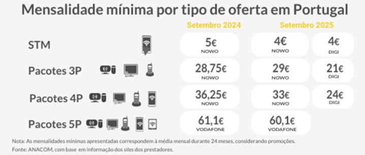 Na análise destacou-se também a Vodafone, com a oferta mais barata nos pacotes com cinco serviços combinados e a NOS, que tem a proposta mais barata para a banda larga móvel através de PC/tablet/pen/router stand alone, com um custo mensal de 7,99 euros.