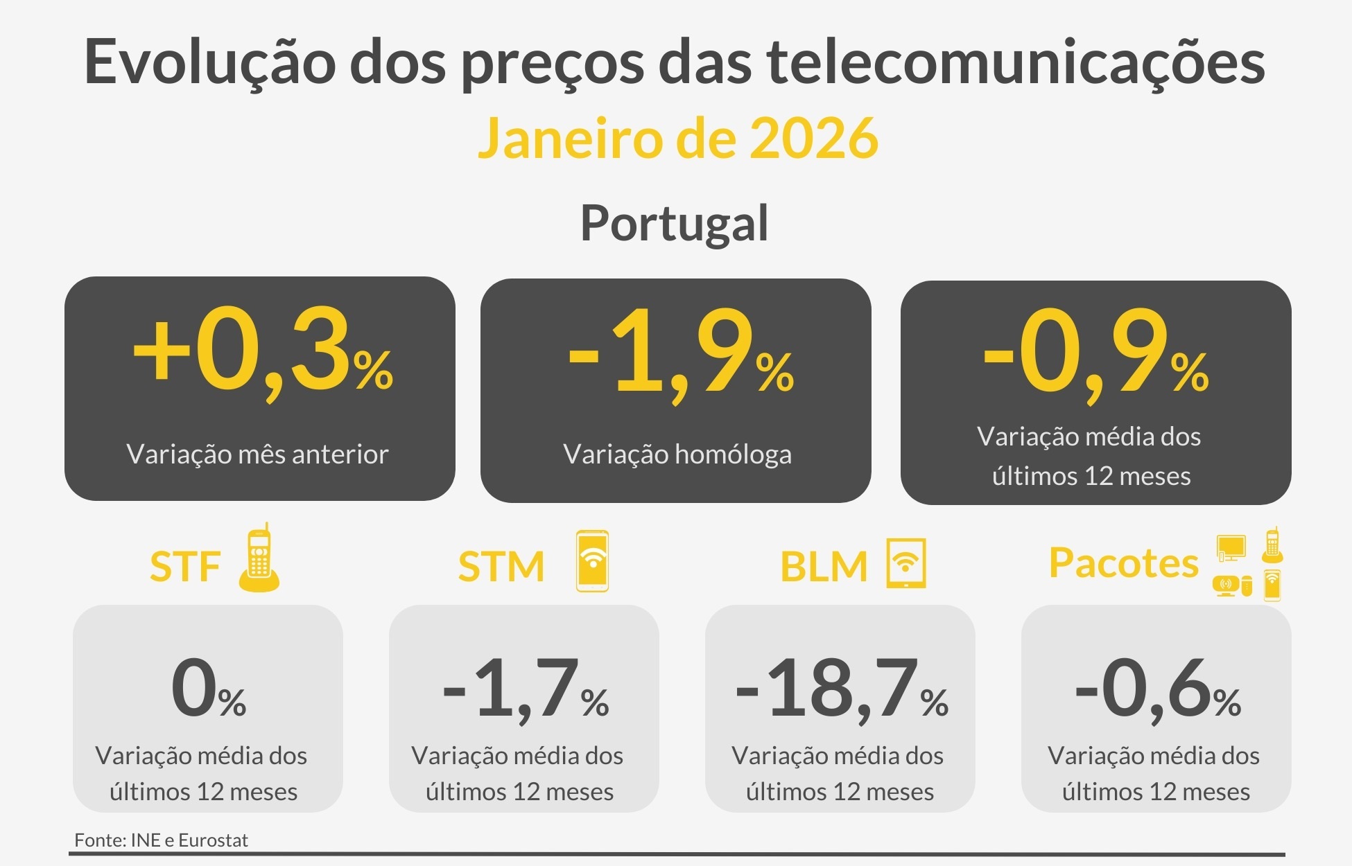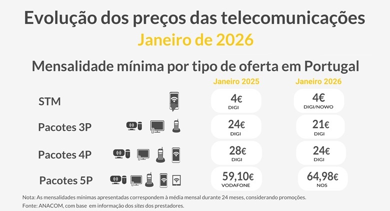 Os preços são medidos através do grupo do Índice de Preços do Consumidor (IPC) e a ANACOM refere que aumentaram 0,3% face ao mês anterior. Ainda assim, quando comparado com o mesmo mês de 2025, há uma redução de 1,9%, indicando ainda o regulador que "a taxa de variação média dos últimos doze meses dos preços das telecomunicações foi de -0,9%".