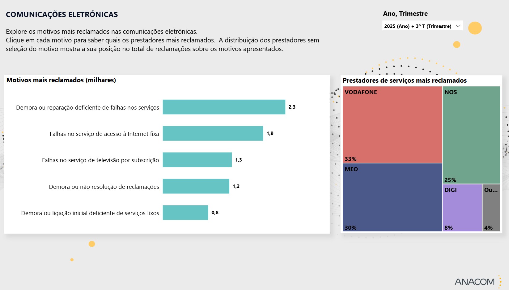 Contam-se ainda questões como falhas no serviço de acesso à Internet fixa, falhas no serviço de televisão por subscrição, demora ou não resolução de reclamações e dificuldades com a ligação inicial de serviços fixos.