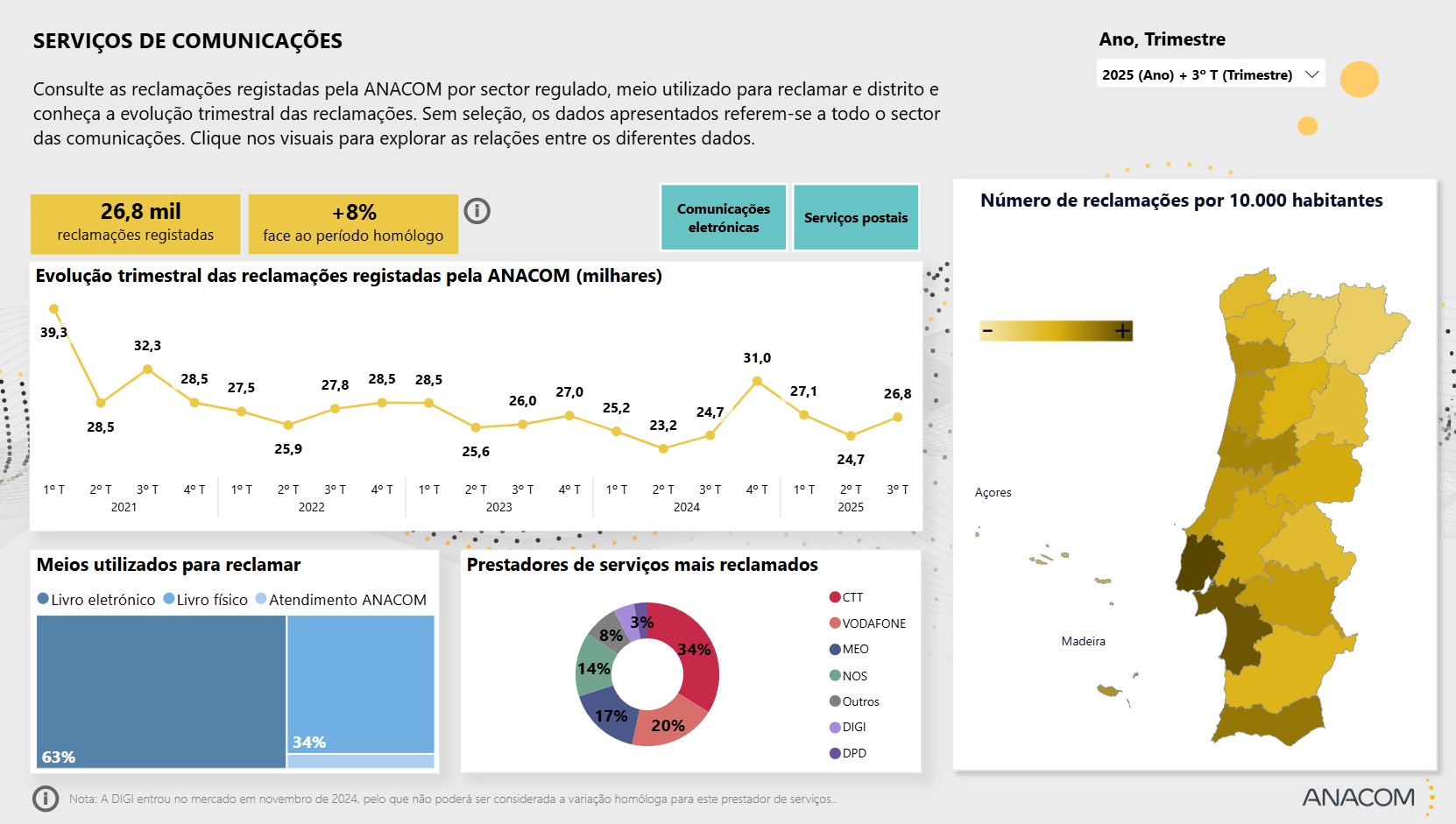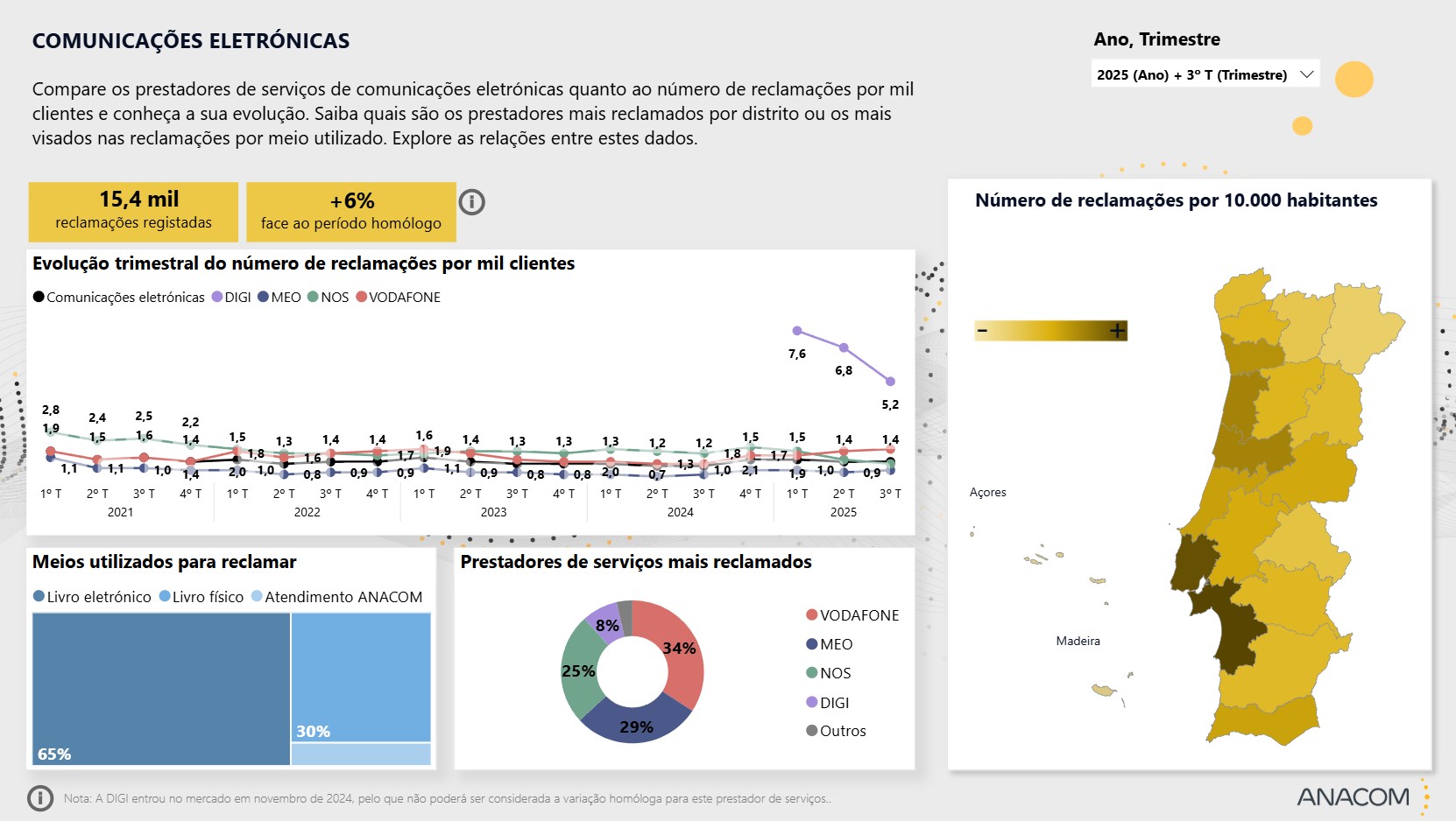 Com 1,2 mil reclamações registadas no terceiro trimestre, a Digi representa 8% das queixas do sector, contando ainda com uma taxa de reclamação que tem vindo a diminuir desde a sua entrada no mercado, passando das 7,6 queixas no quarto trimestre de 2024 para as 5,2 reclamações por mil clientes no período em análise.