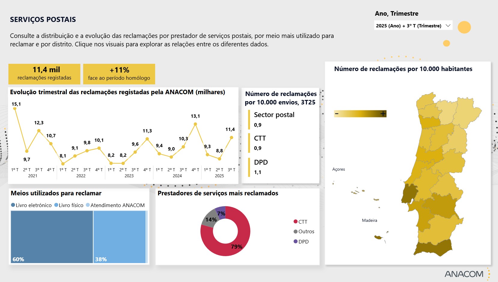 Olhando para as reclamações no serviço postal, no terceiro trimestre do ano, os CTT registam 9,1 mil reclamações (79% do total do sector), numa subida de 9% face ao mesmo período em 2024. Este volume corresponde a quase uma reclamação (0,9) por cada 10.000 envios postais, afirma a ANACOM.