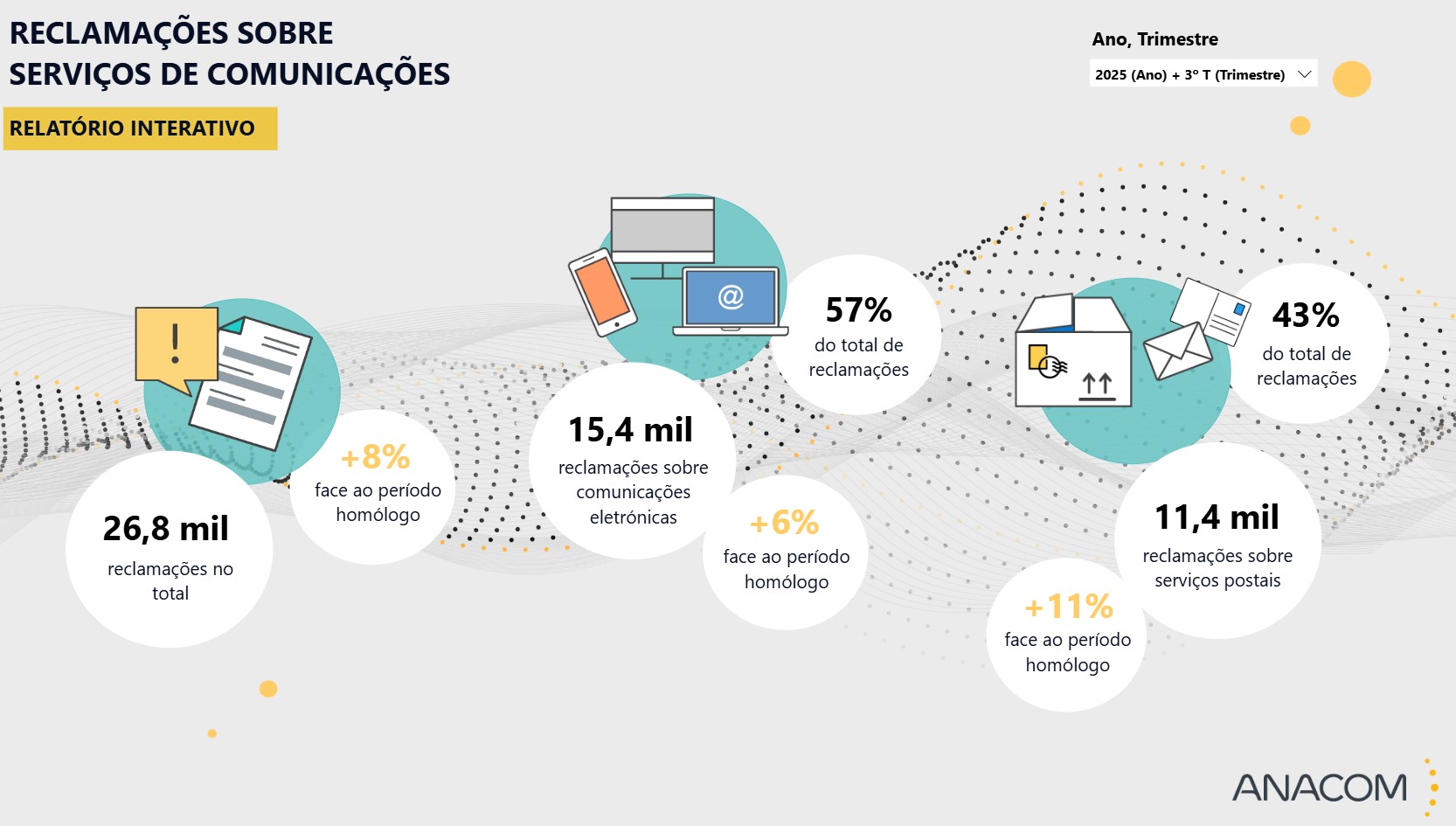 Em comunicado, a ANACOM indica que o aumento foi motivado principalmente pelos serviços postais, que registaram um aumento de 11% nas queixas durante o período em análise. As reclamações sobre os serviços de comunicações eletrónicas também aumentaram durante este período e pelo terceiro trimestre consecutivo, numa subida de 6%, num total de 15,4 mil queixas (57% do total).
