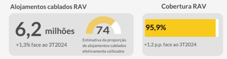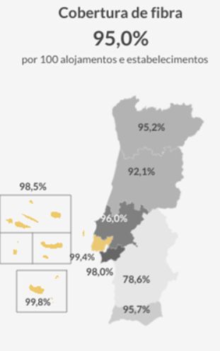 Em termos de cobertura, no mínimo, 6,2 milhões de casas estavam cabladas com tecnologias de banda larga fixa no final de setembro, mais 1,3% do que no mesmo período do ano anterior, chegando assim a 95,9% dos alojamentos.