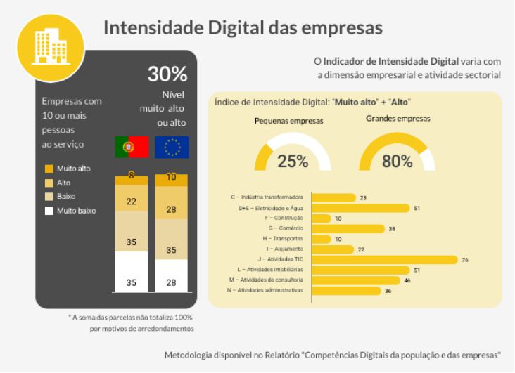 Nas empresas, o Digital Intensity Index v3 concluiu que cerca de 30% das organizações portuguesas com 10 ou mais pessoas tinham em 2025 um Índice de Intensidade Digital classificado “alto” ou “muito alto”, deixando Portugal na 19.ª posição do ranking da UE27, abaixo da média europeia (37,6%).