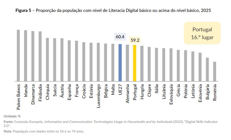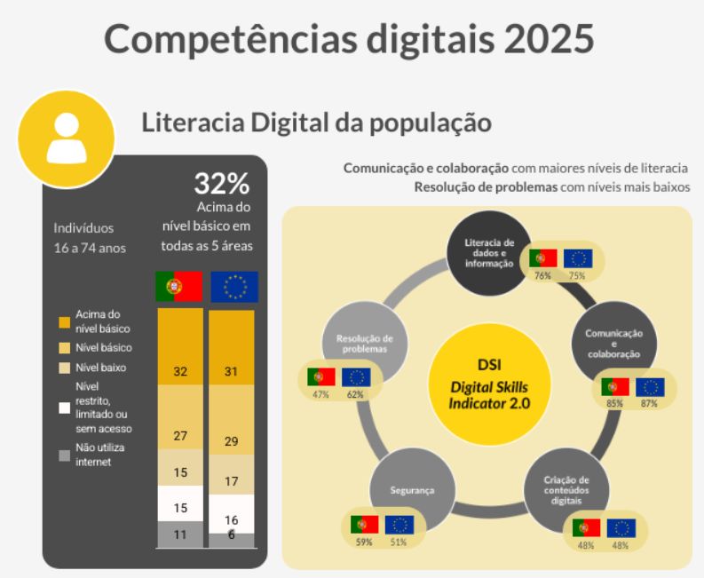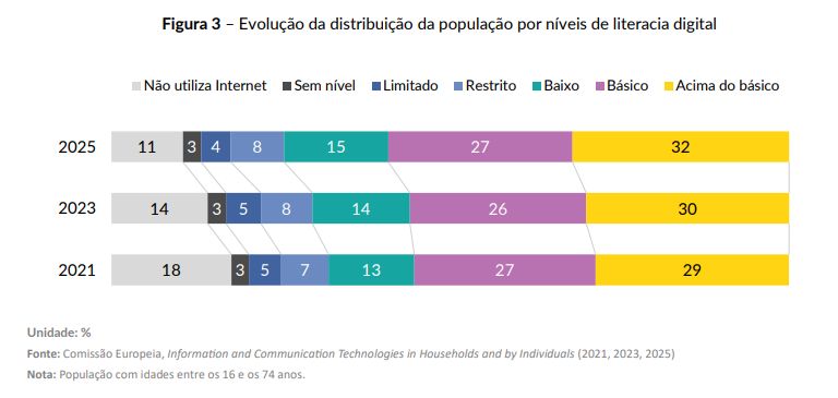 Também mostra que 27,2% da população têm apenas um nível básico de competências digitais e que 27,6% estão abaixo disso, enquanto 2,7% não têm competências e 10,6% nem sequer usavam a internet quando os dados foram recolhidos.