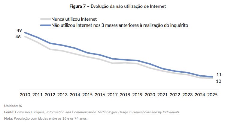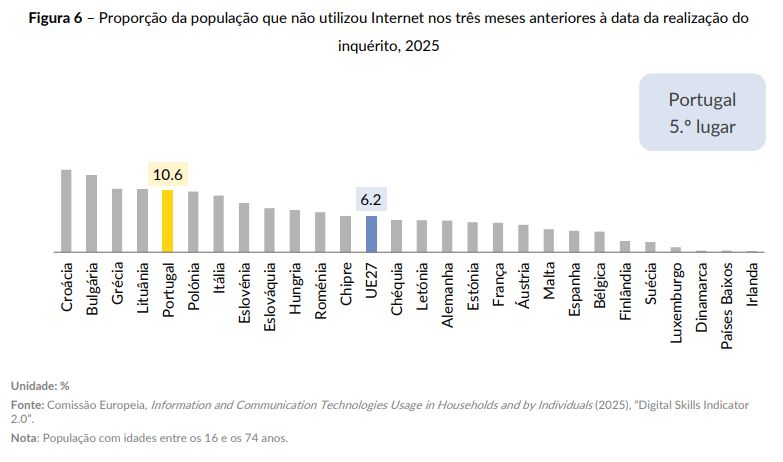 Este é um indicador que tem, no entanto, vindo a melhorar, com o número de pessoas sem contacto com a internet a descer. Em 2021 ascendia a 17,7%, a passagem para 10,6% em 2025 pôs Portugal na quinta posição do ranking da UE27.