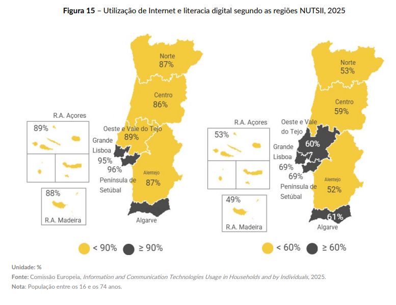 Os jovens até aos 34 anos e as populações de zonas urbanas são os que têm níveis de literacia digital mais elevados, com destaque para regiões como a Grande Lisboa e a Península de Setúbal. Os níveis mais baixos de literacia estão no Alentejo e nas Regiões Autónomas da Madeira e dos Açores.