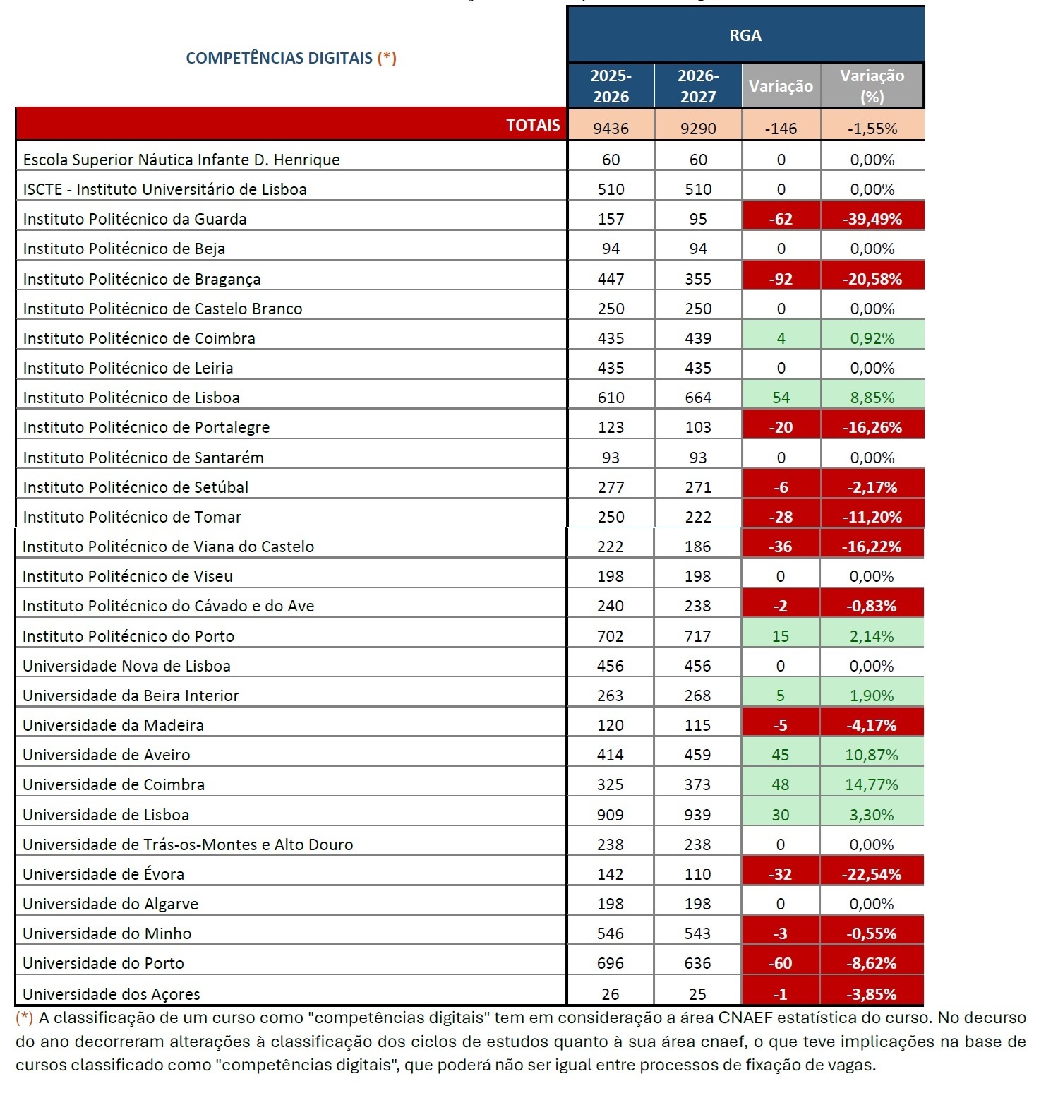 Relativamente à área de competências digitais, existem 9.290 vagas em cursos de formação nesta área. Apesar da imposição da manutenção, no mínimo do número de vagas nesta área, tal como em Medicina, o ministério indica que "atendendo às alterações no procedimento de classificação dos ciclos de estudos quanto à sua área CNAEF, o universo de cursos classificados em 2025 poderá não corresponder na sua totalidade aos cursos que em 2026 visam formação em competências digitais".