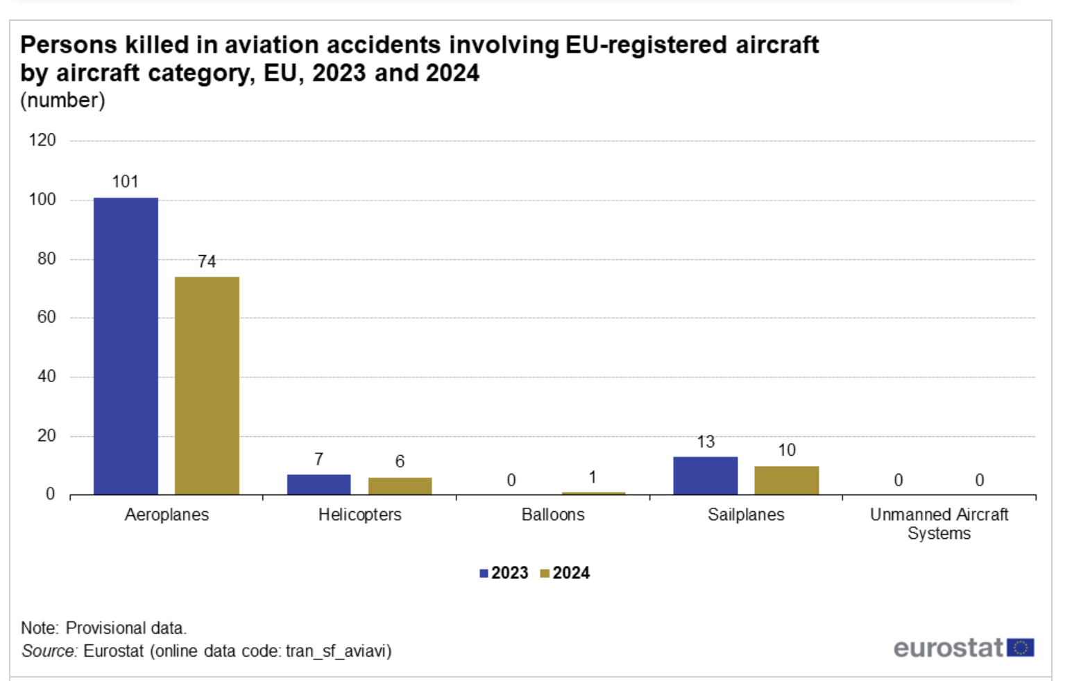 Segundo a informação recolhida, os acidentes responsáveis por mais mortes foram de aeronaves, com 74 casos, seguidos de planadores (10), helicópteros (6) e balões (1). "Não foram observados acidentes fatais ou feridos envolvendo aeronaves não tripuladas nos últimos 2 anos", refere o Eurostat.