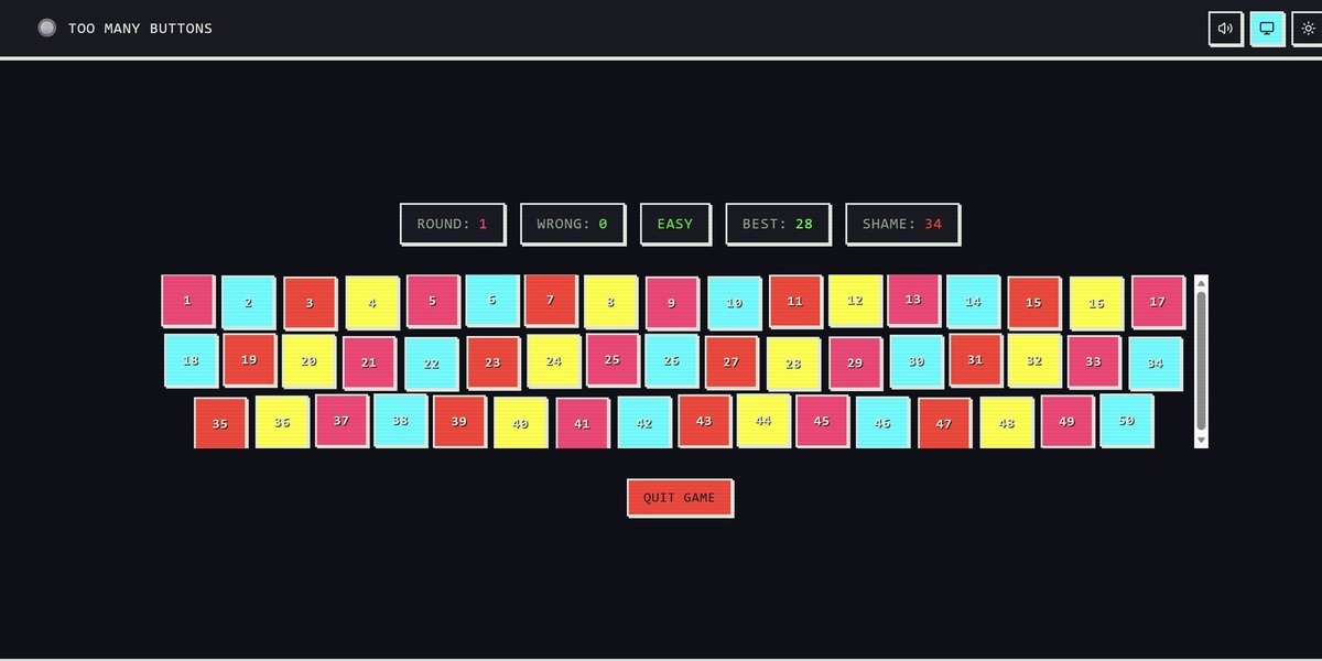 Em Too Many Buttons há dois modos de jogo disponíveis. No modo Classic, é possível divertir-se a clicar e a tentar encontrar o botão certo sem limites de tempo. Já o modo Speedrun torna as coisas ainda mais desafiantes e tem apenas 60 segundos para completar a sua missão.