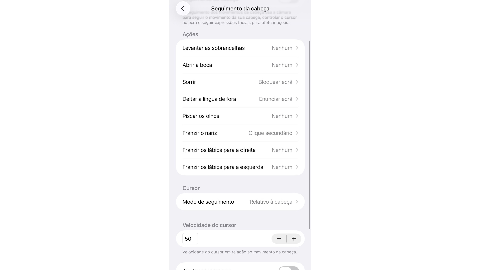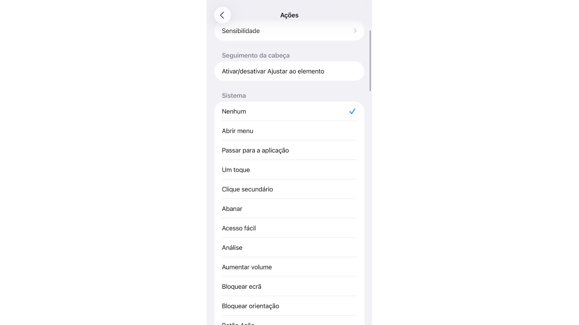 6 - Define o que faz o movimento na longa lista. Em cima pode definir a sensibilidade da deteção. Quando regressa ao menu principal vai notar um círculo com opções rápidas e um cursor que segue os movimentos da cabeça.