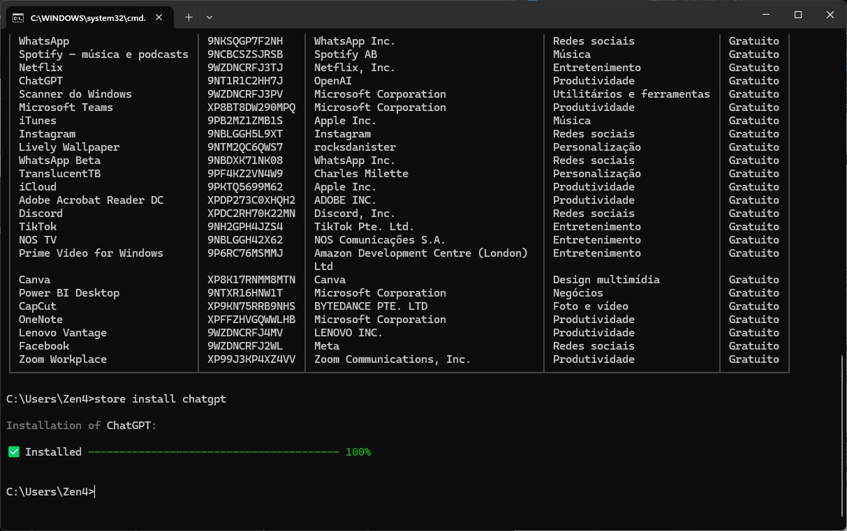 Para instalar uma das aplicações indicadas nessa listagem, apenas precisará de usar o comando de instalação apropriado. Vamos usar, como exemplo, o ChatGPT. Para tal, usamos o comando “store install chatgpt”, usando as setas no teclado de seguida para confirmar a instalação, ou cancelar a instalação. Todo o processo decorre através da linha de comandos, apresentando um gráfico, estilo código ASCII, que indica a percentagem do processo de instalação.