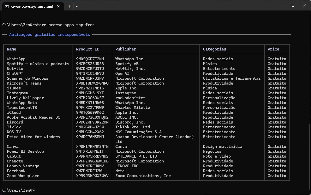 Convém lembrar que estes comandos são apenas os principais, ou seja, existem depois as subcategorias, como por exemplo, procurar quais as aplicações mais descarregadas dentro das gratuitas, usando o comando “store browse-apps top-free”. Nesse ecrã, depois encontrará nas diferentes colunas, o nome da aplicação, o código da mesma (Product ID), o editor (Publisher), a categoria e o preço.
