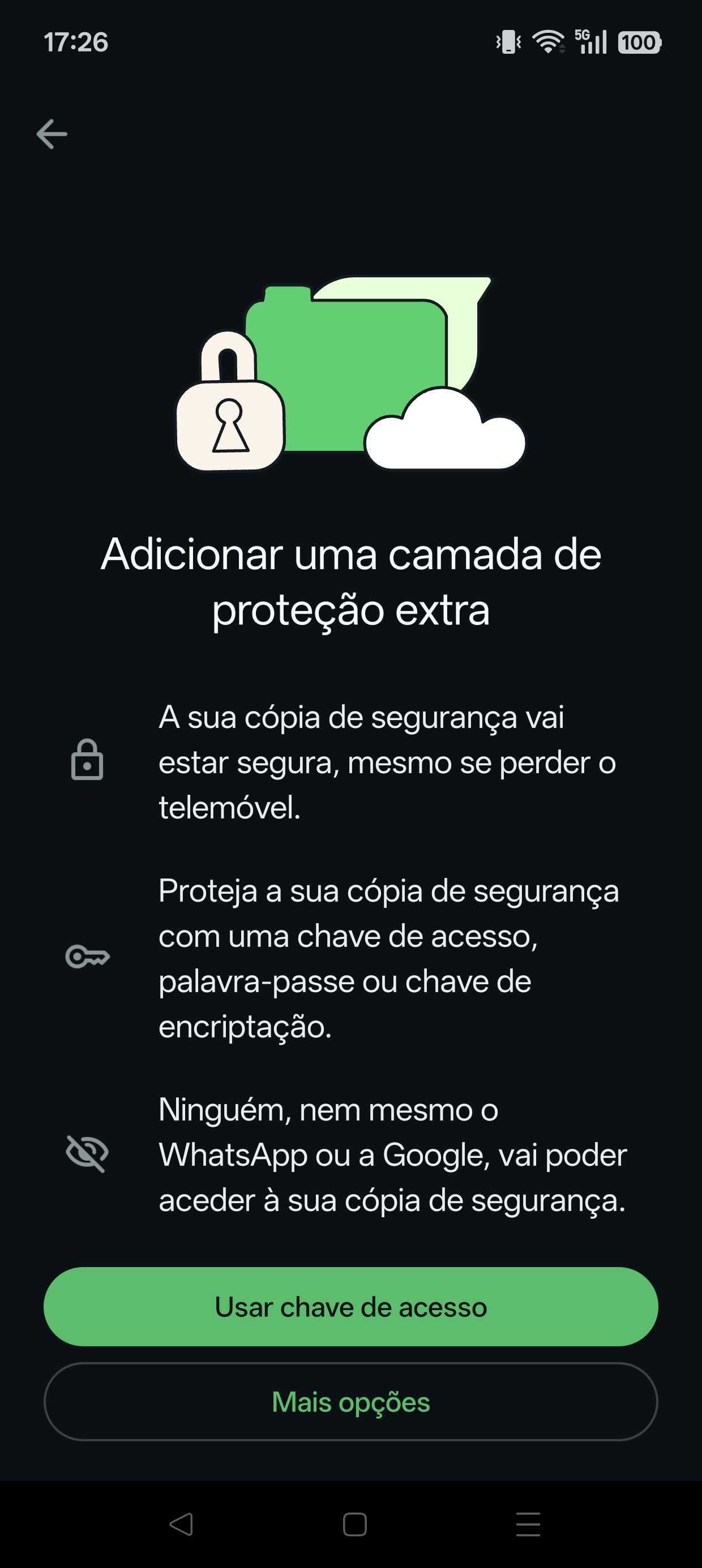 Recorrendo ao método de chaves de acesso, passa a ser possível usar métodos de acesso como a leitura de impressão digital, reconhecimento facial, ou o uso de um código de bloqueio de ecrã. Desta forma, agora bastará um toque ou um olhar para garantir a mesma segurança que protege as suas conversas e chamadas pessoais no WhatsApp de ser aplicada também às suas cópias de segurança. Descubra agora como ativar essa funcionalidade adicional: